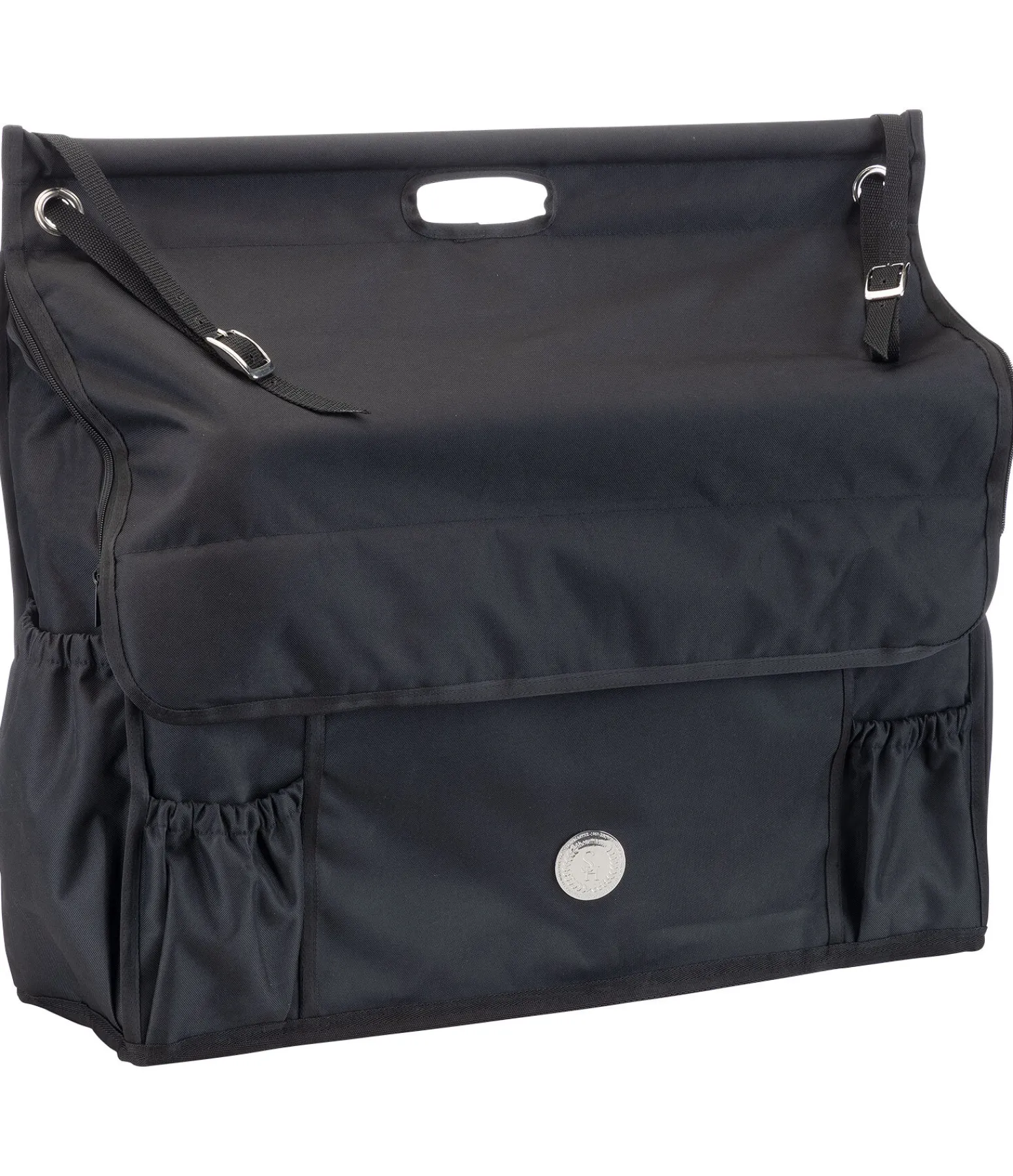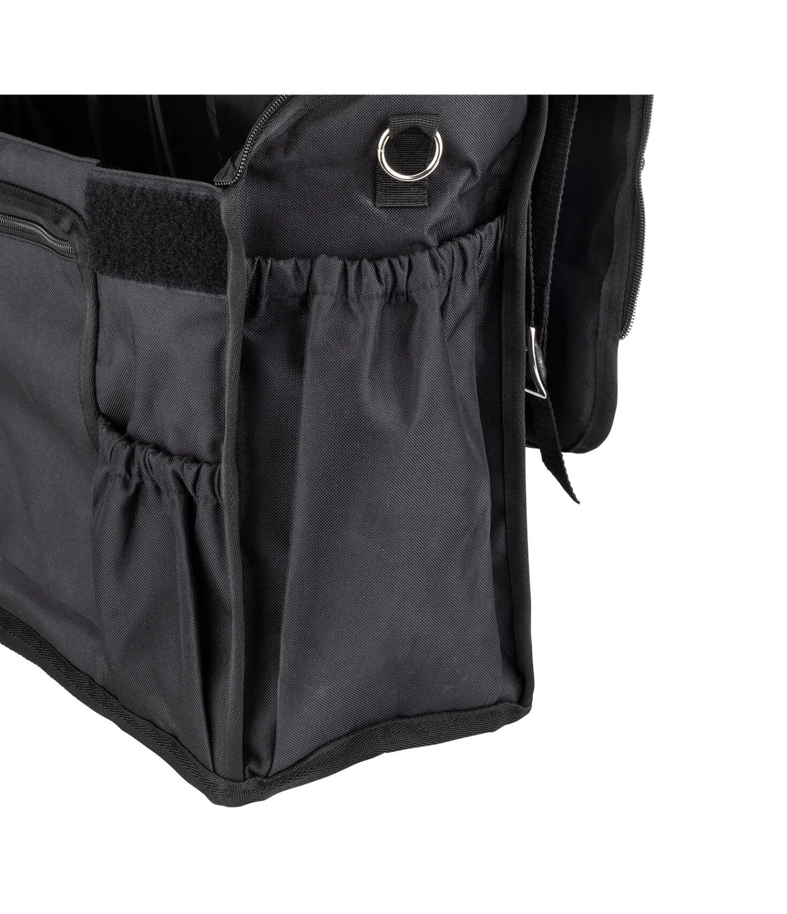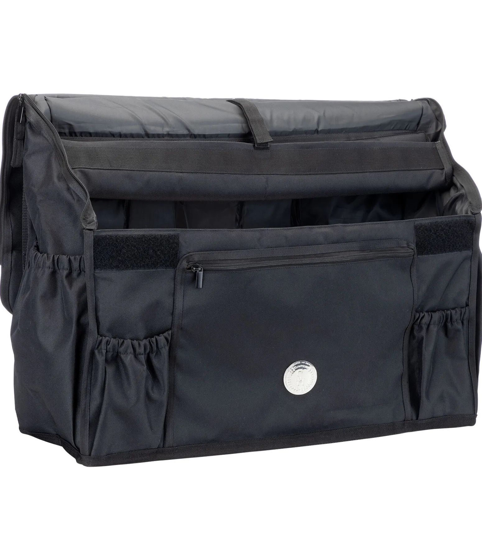 Sac pour le box spacieux avec rangements modulables à l’intérieur. Fermeture par pattes auto-agrippantes et fermeture à glissière pour une protection optimale contre les saletés. Deux poches à l’avant et sur les côtés. Poche zippée à l’avant et anneaux sur les côtés. Compartiment de rangement pour les bandes. Deux sangles réglables pour la fixation au box et poignée de transport. Jolie plaque métallique SHOWMASTER. 61 x 70 x 18 cm. 100 % polyester.