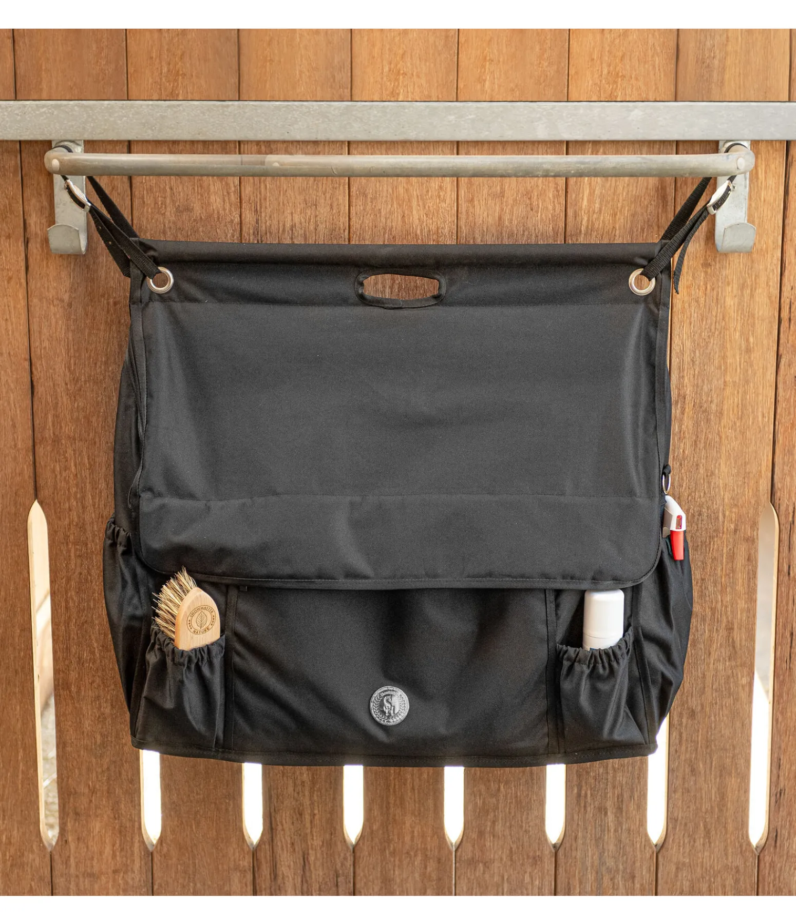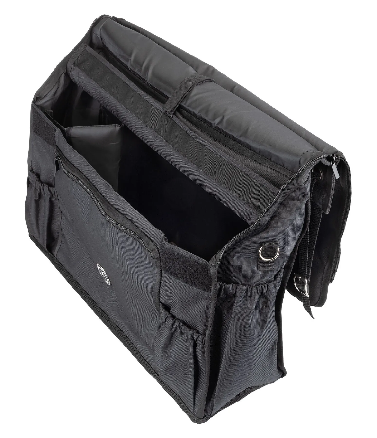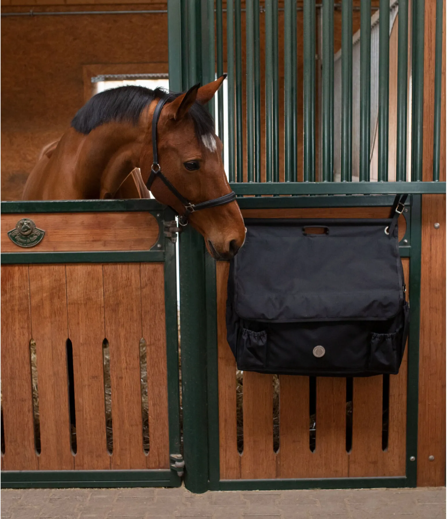 Sac pour le box spacieux avec rangements modulables à l’intérieur. Fermeture par pattes auto-agrippantes et fermeture à glissière pour une protection optimale contre les saletés. Deux poches à l’avant et sur les côtés. Poche zippée à l’avant et anneaux sur les côtés. Compartiment de rangement pour les bandes. Deux sangles réglables pour la fixation au box et poignée de transport. Jolie plaque métallique SHOWMASTER. 61 x 70 x 18 cm. 100 % polyester.