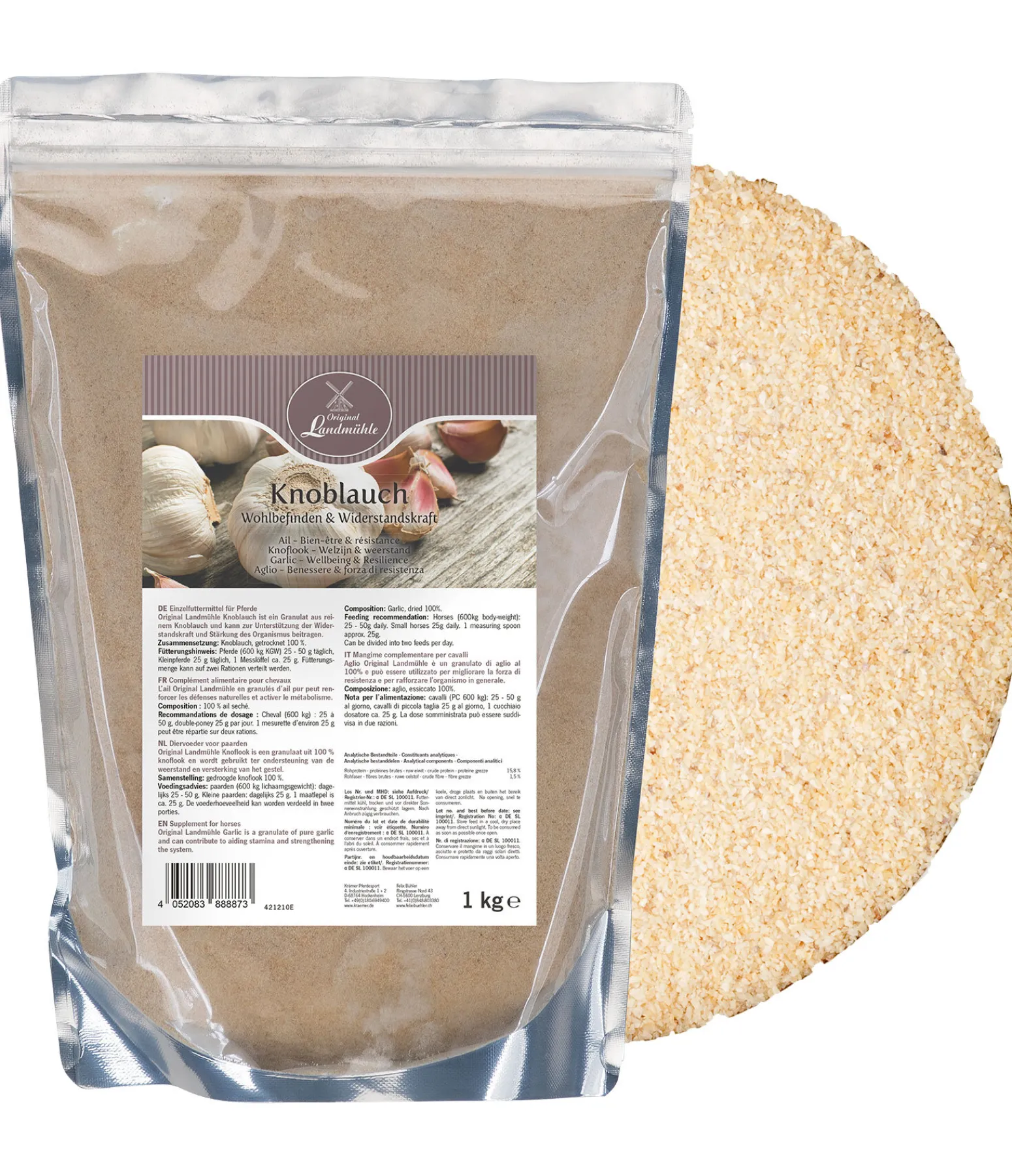 Poudre à base d’ail pur. Pour accroître la résistance et renforcer l’organisme. Effet répulsif naturel contre les insectes.