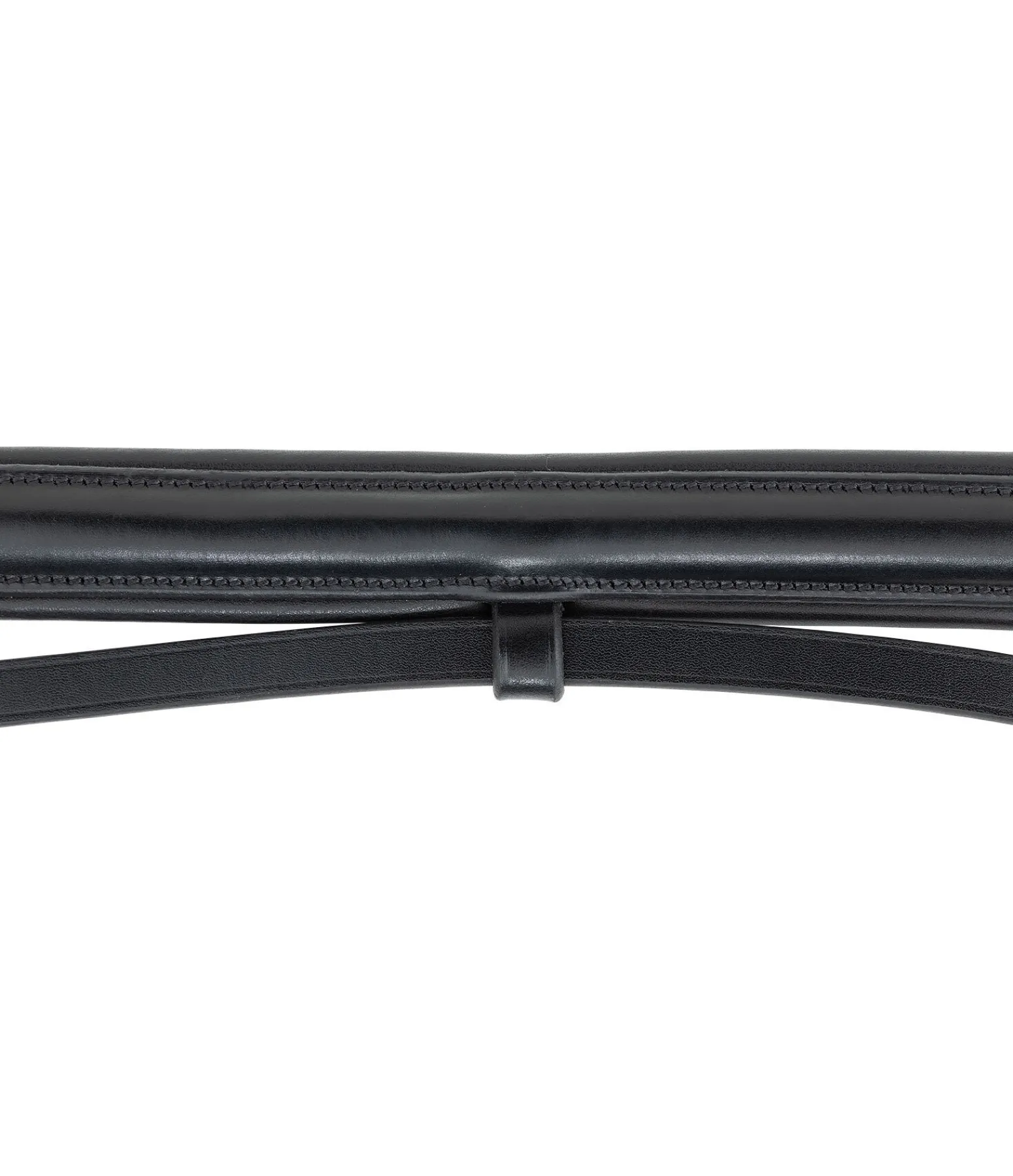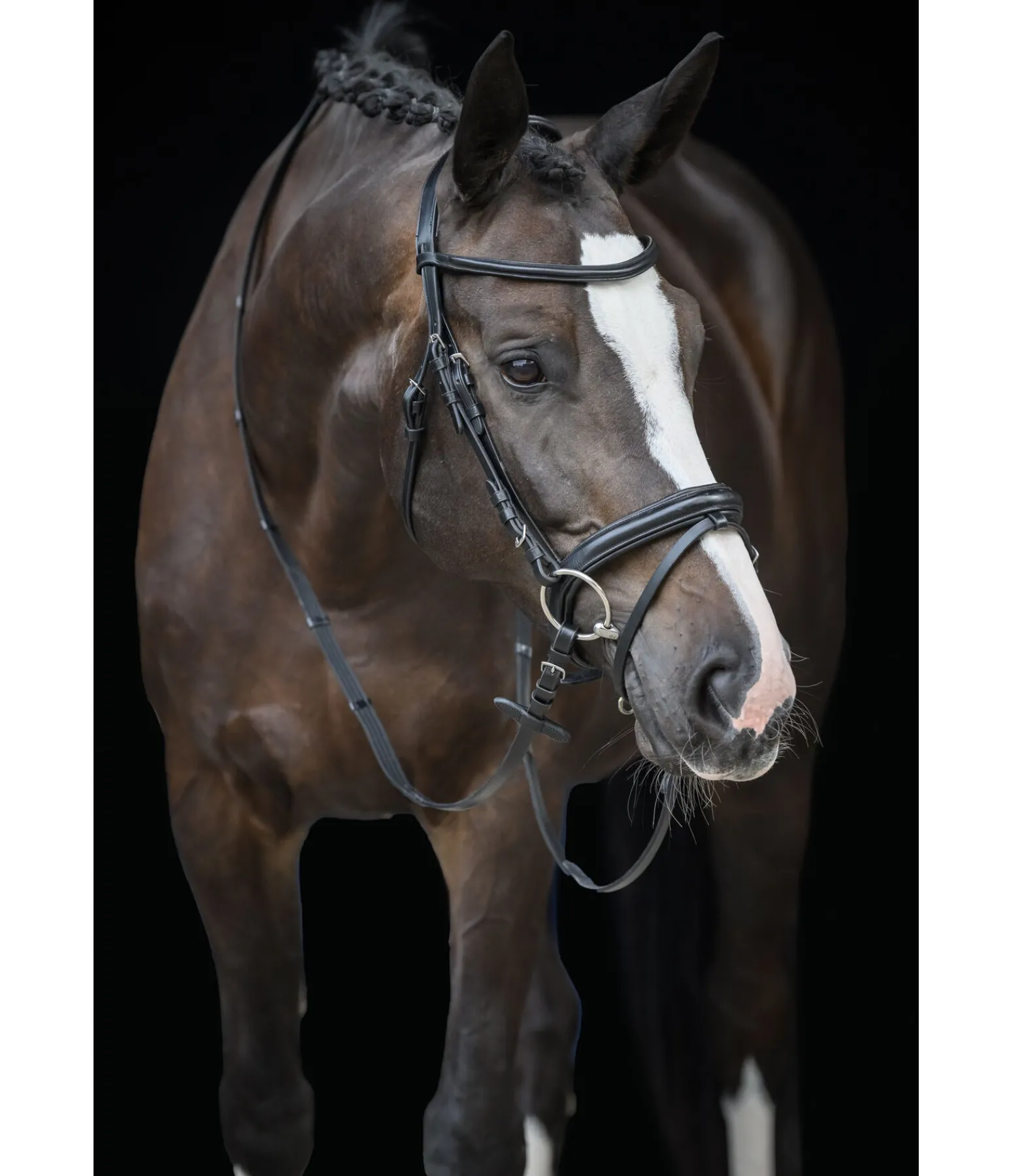 Élégant bridon en cuir avec têtière anatomique innovante assurant un soulagement optimal de la pression dans la zone de la nuque grâce à sa doublure douce et sa découpe large aux oreilles. La large muserolle française combinée est également doublée. Frontal vague classique. Bouclerie argentée. Avec rênes sangle, sans mors.