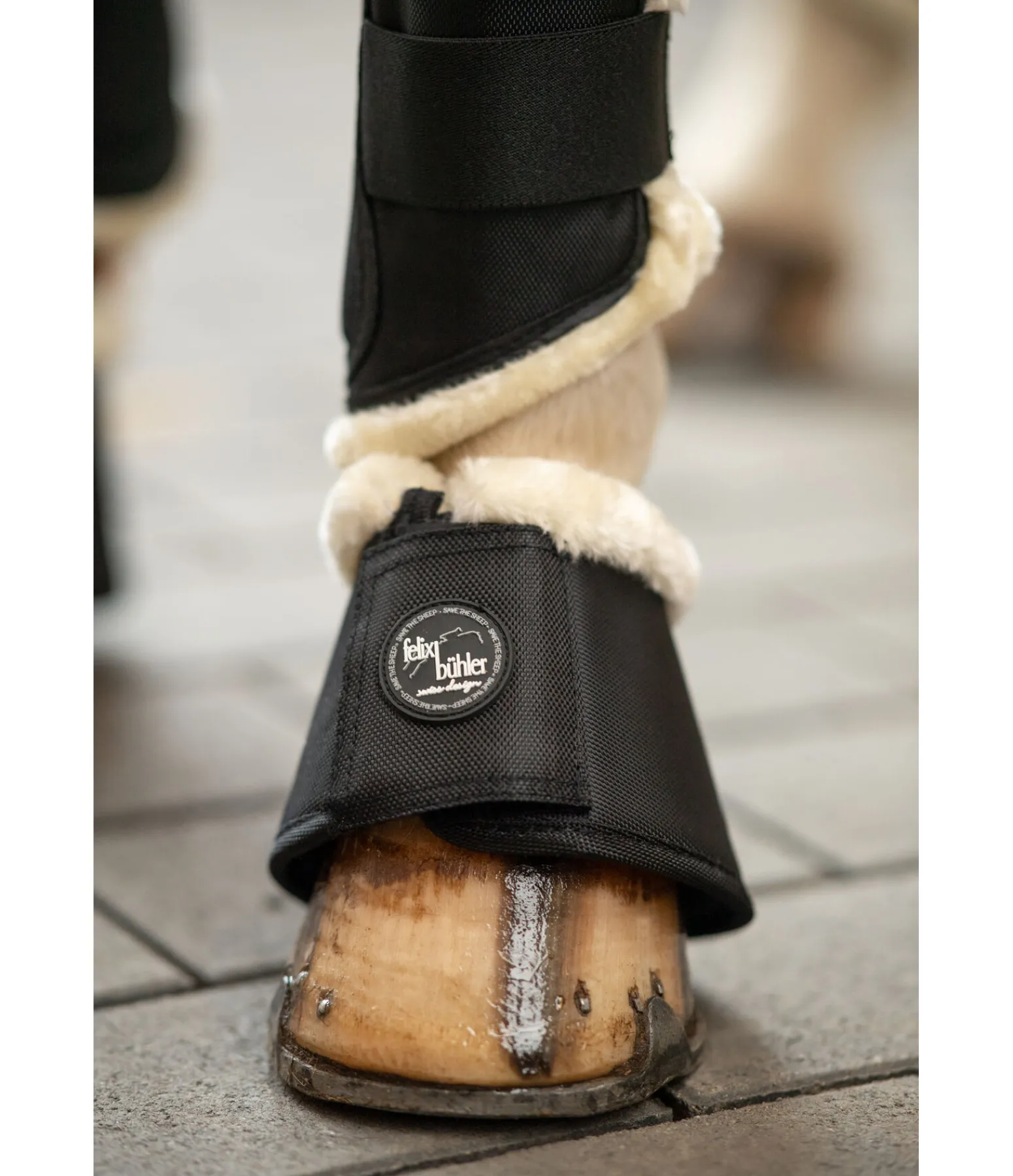 Doublure intérieure en caoutchouc chloroprène. Extérieur en matière robuste. Bordure en fourrure synthétique douce pour éviter les irritations dues aux frottements. Double patte auto-agrippante pour un maintien sûr. 100 % polyester. Vendues par paire.