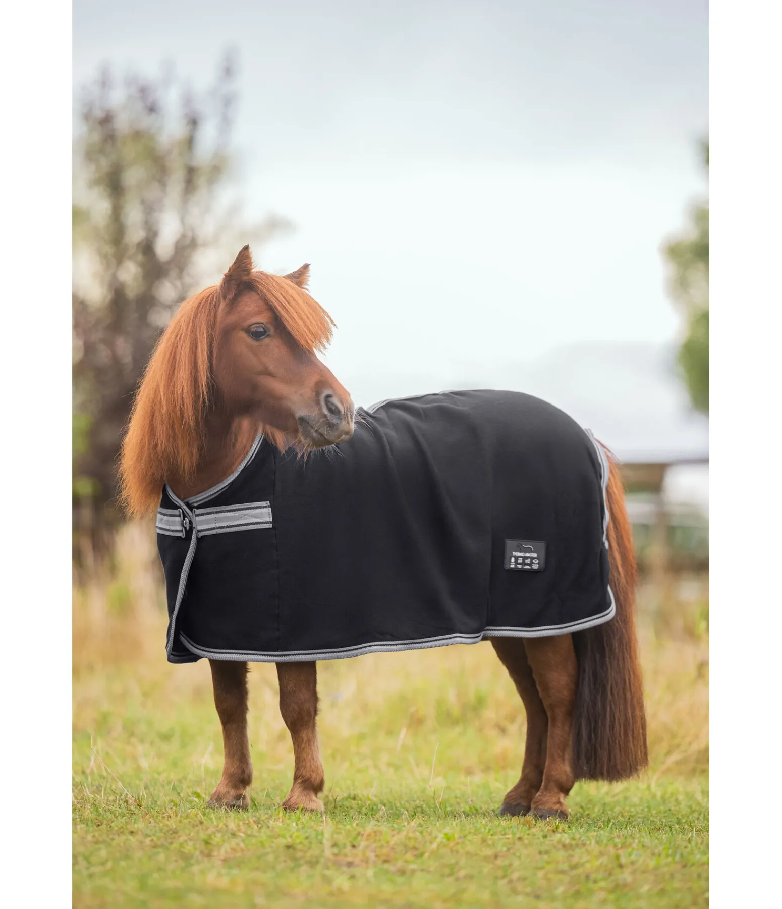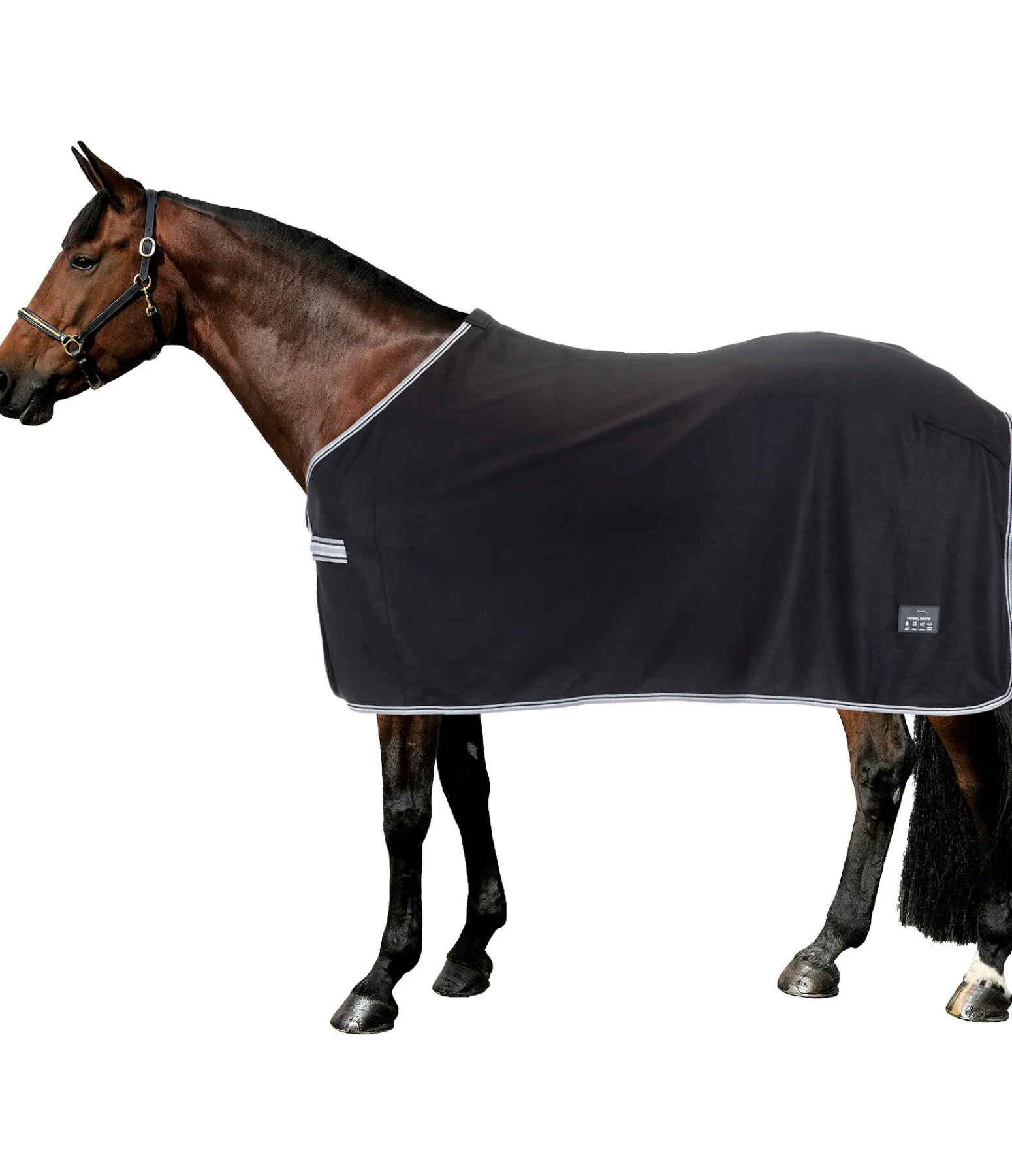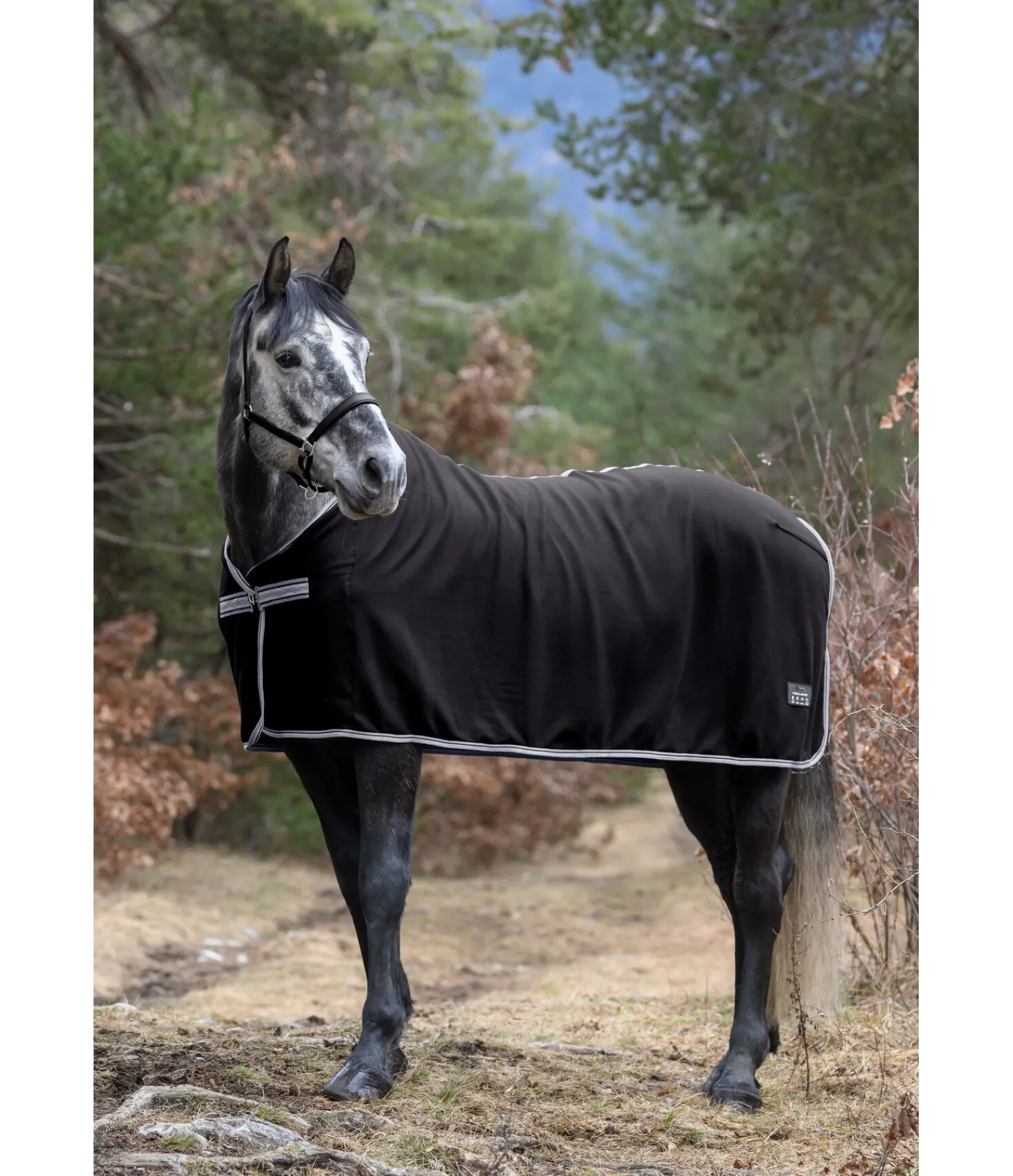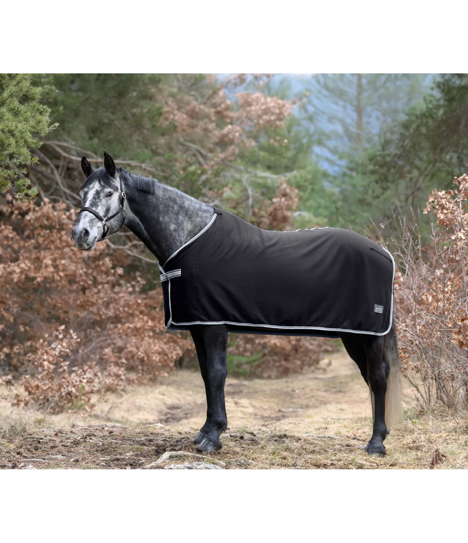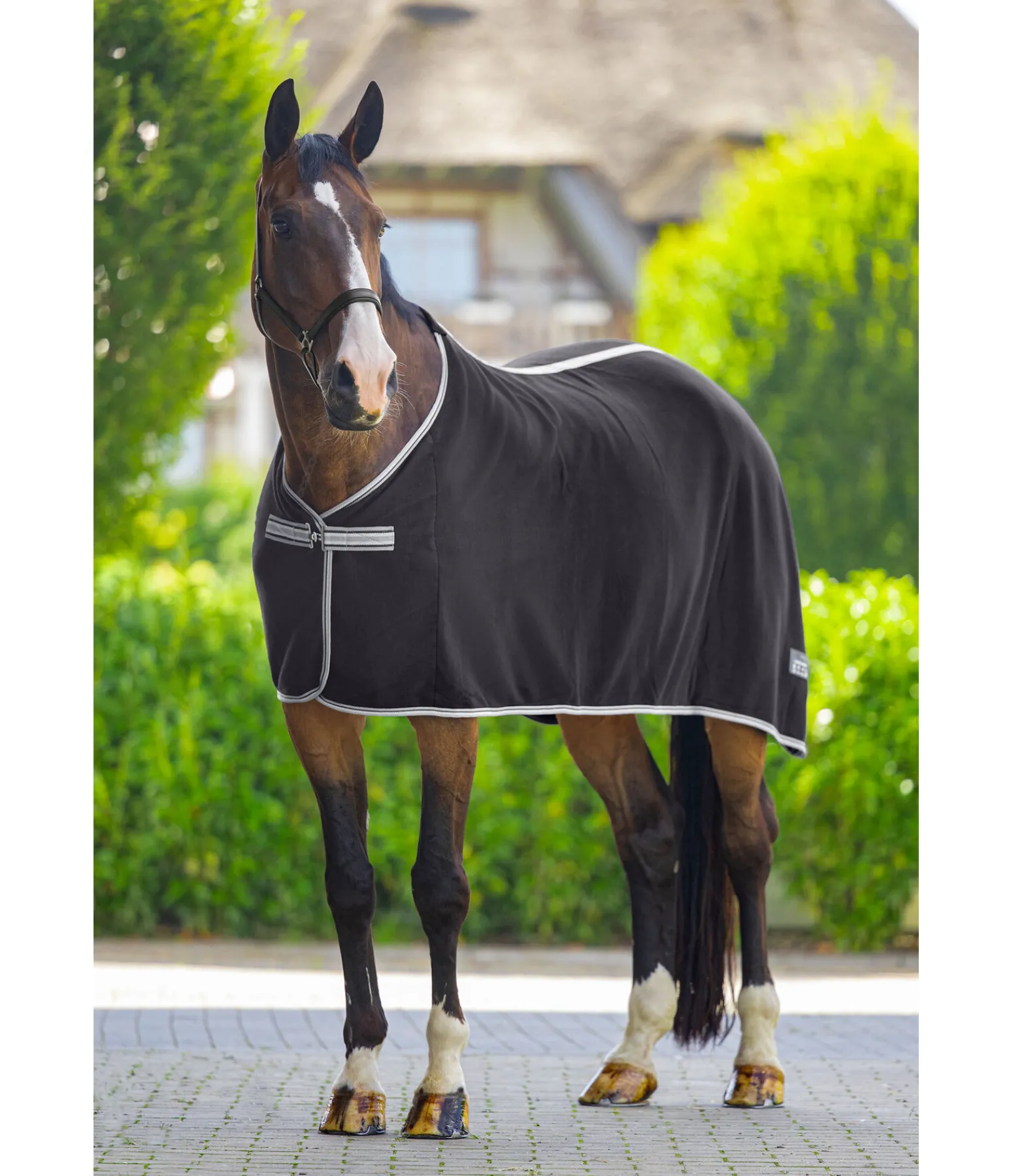 Couverture séchante en polaire, simple et élégante. Fermeture de poitrail avec crochet en T. Pad de garrot en polaire douce et doublure lisse satinée au niveau des épaules pour éviter la casse des crins et les irritations dues aux frottements. 100 % polyester.