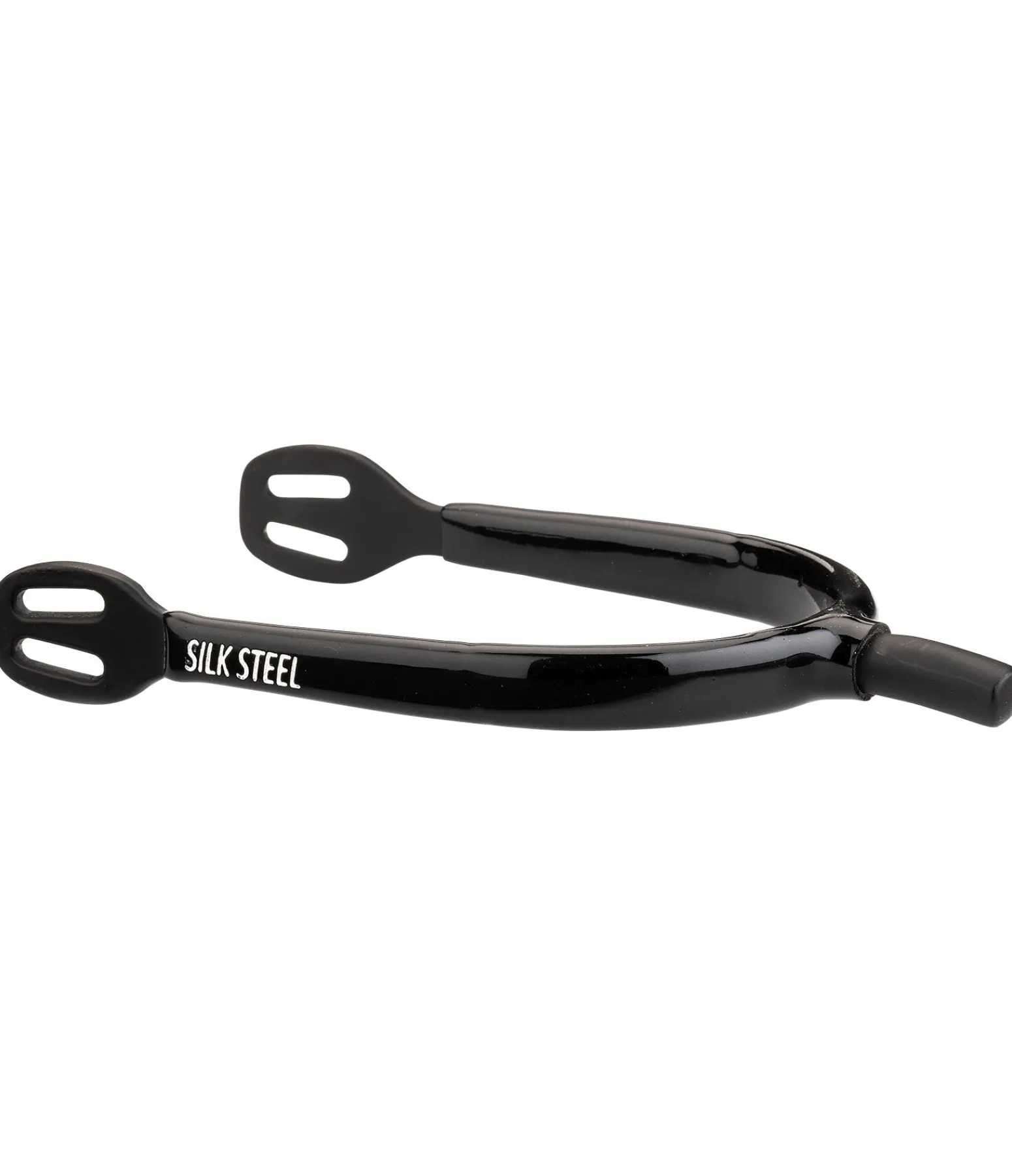 Éperons noirs mats en acier inoxydable. Forme améliorée des oeillets facilitant le passage des lanières. Revêtement en silicone avec inscription SILK STEEL. Longueur de la tige 25 mm.