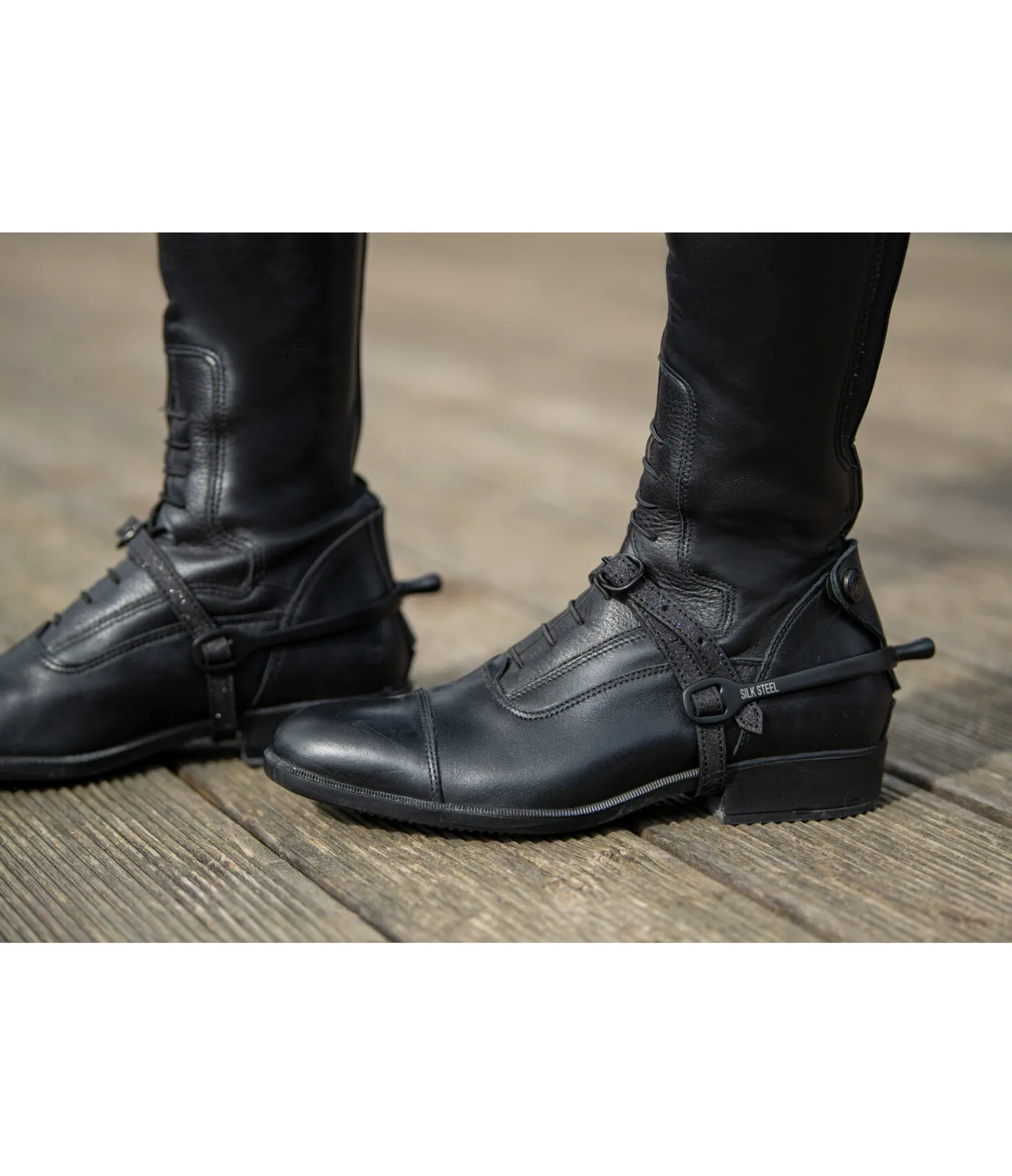 Lanières d’éperons scintillantes. Intérieur en cuir souple pour préserver la botte. Boucle noire. Vendues par paire.