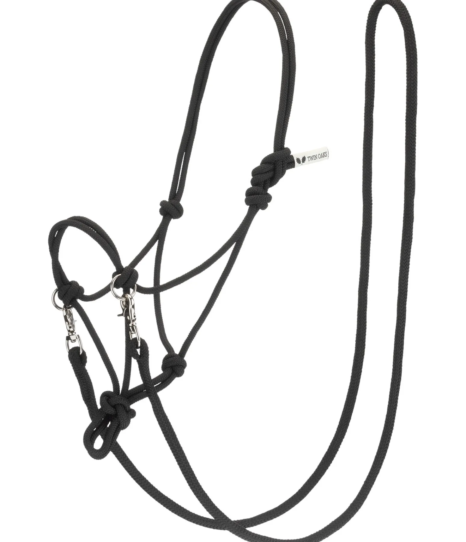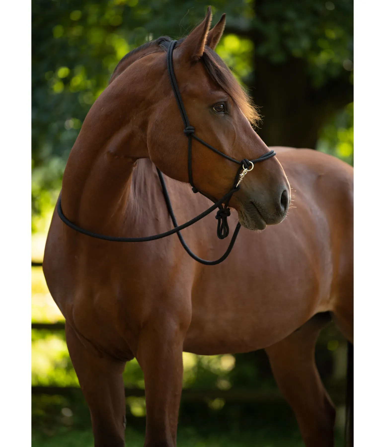 Licol à noeuds avec anneaux et rênes fermées à mousquetons. Longueur des rênes 2,6 m.