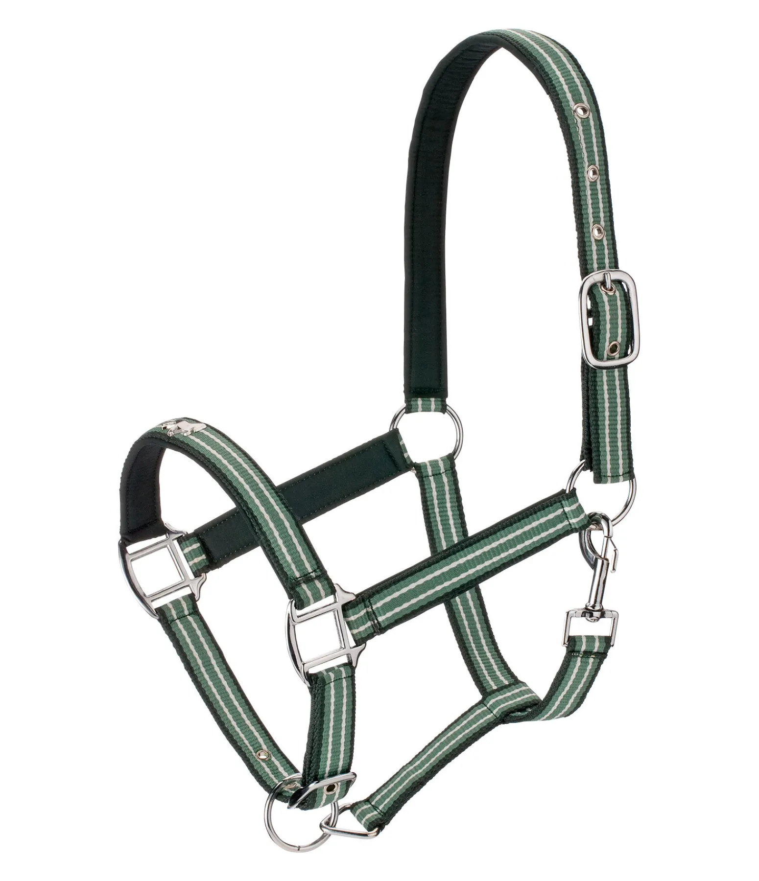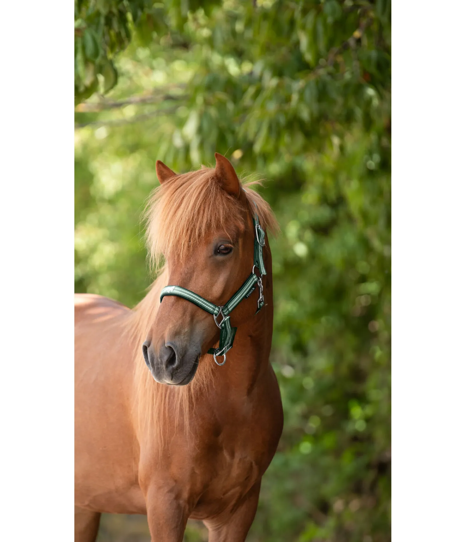 Licol au look sportif. Médaillon argenté en forme de cheval islandais sur la muserolle. Doublure moelleuse. Têtière et muserolle réglables.