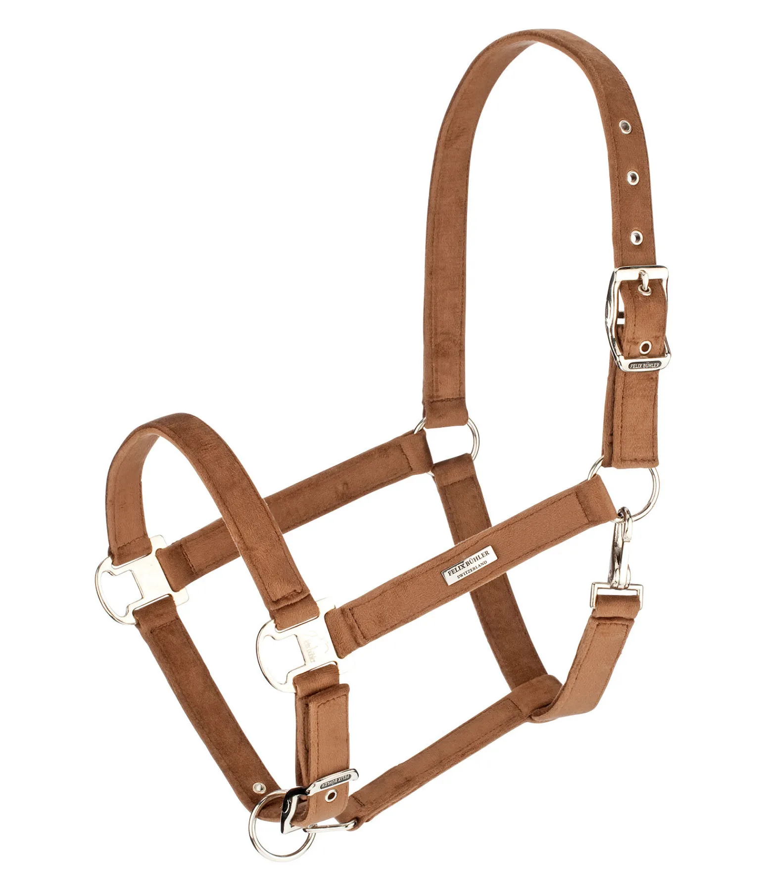 Élégant licol entièrement doublé en matière satinée. Avec plaque logo métallique brillante. Têtière et muserolle réglables. 100 % polypropylène.