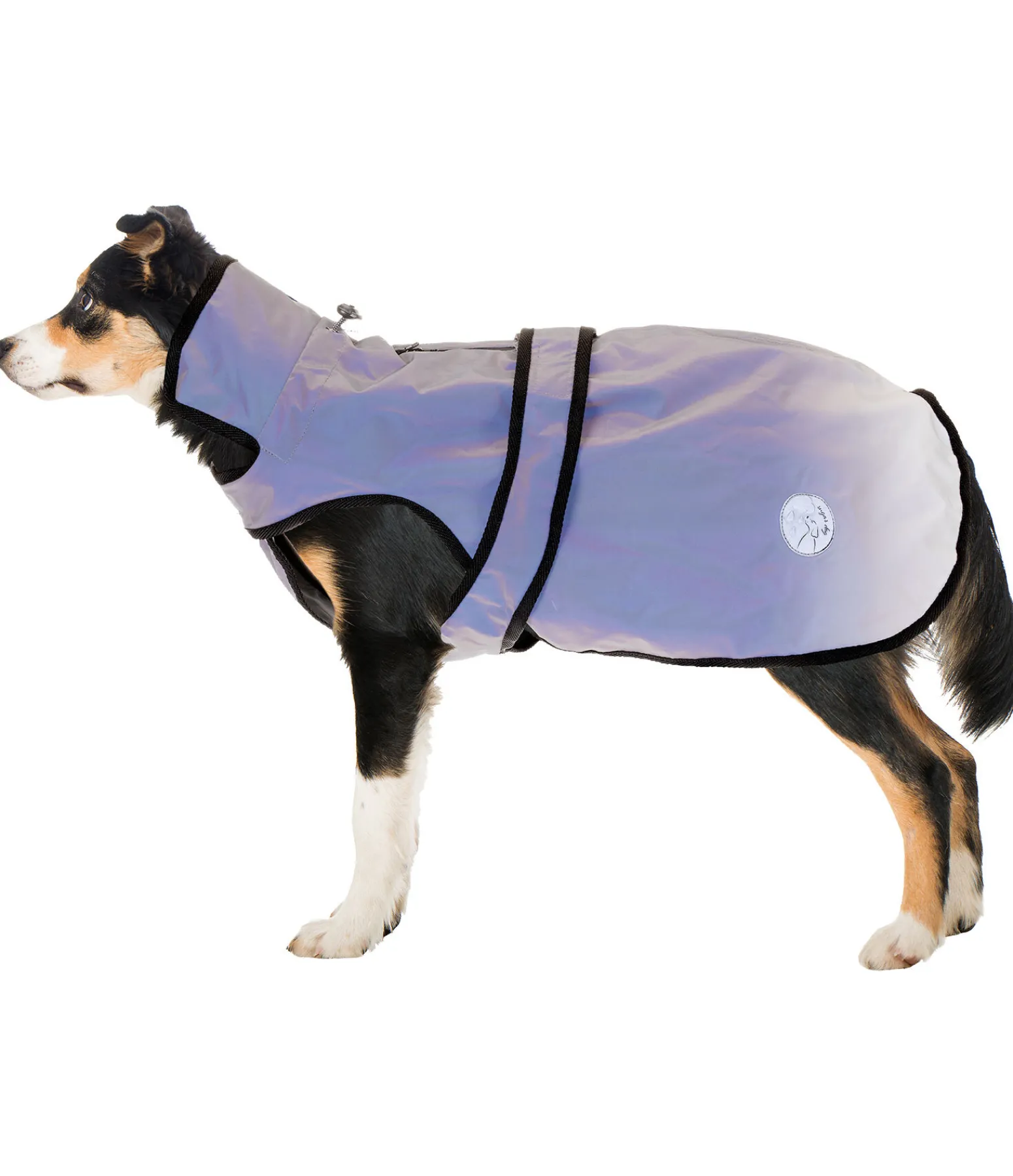 Manteau sportswear pour chien avec revêtement réfléchissant dans un joli dégradé de couleurs. Imprimé logo réfléchissant. Col réglable par élastique de serrage avec stop cordon. Facile à enfiler grâce aux pattes auto-agrippantes au poitrail et au ventre. Aucun risque que le manteau ne glisse grâce aux courroies de cuisses dissimulées. Rêvetement 100 % polyester, doublure 100 % polyester.