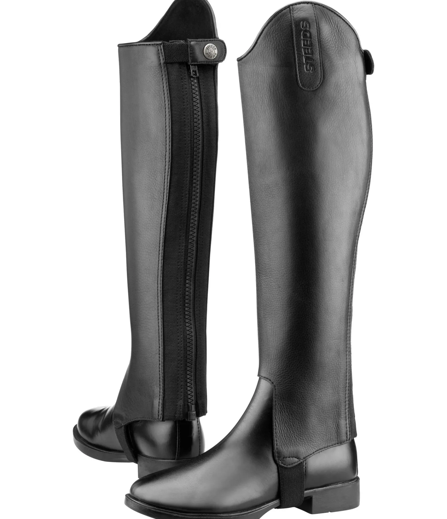 Mini-chaps de grande qualité en cuir de vachette pleine fleur doux et doublure intérieure en synthétique Amara. Les empiècements élastiques de chaque côté de la fermeture à glissière assurent un ajustement parfait au mollet. La large fermeture à glissière YKK à l’arrière ainsi que les sous-pieds résistants assurent leur longévité.