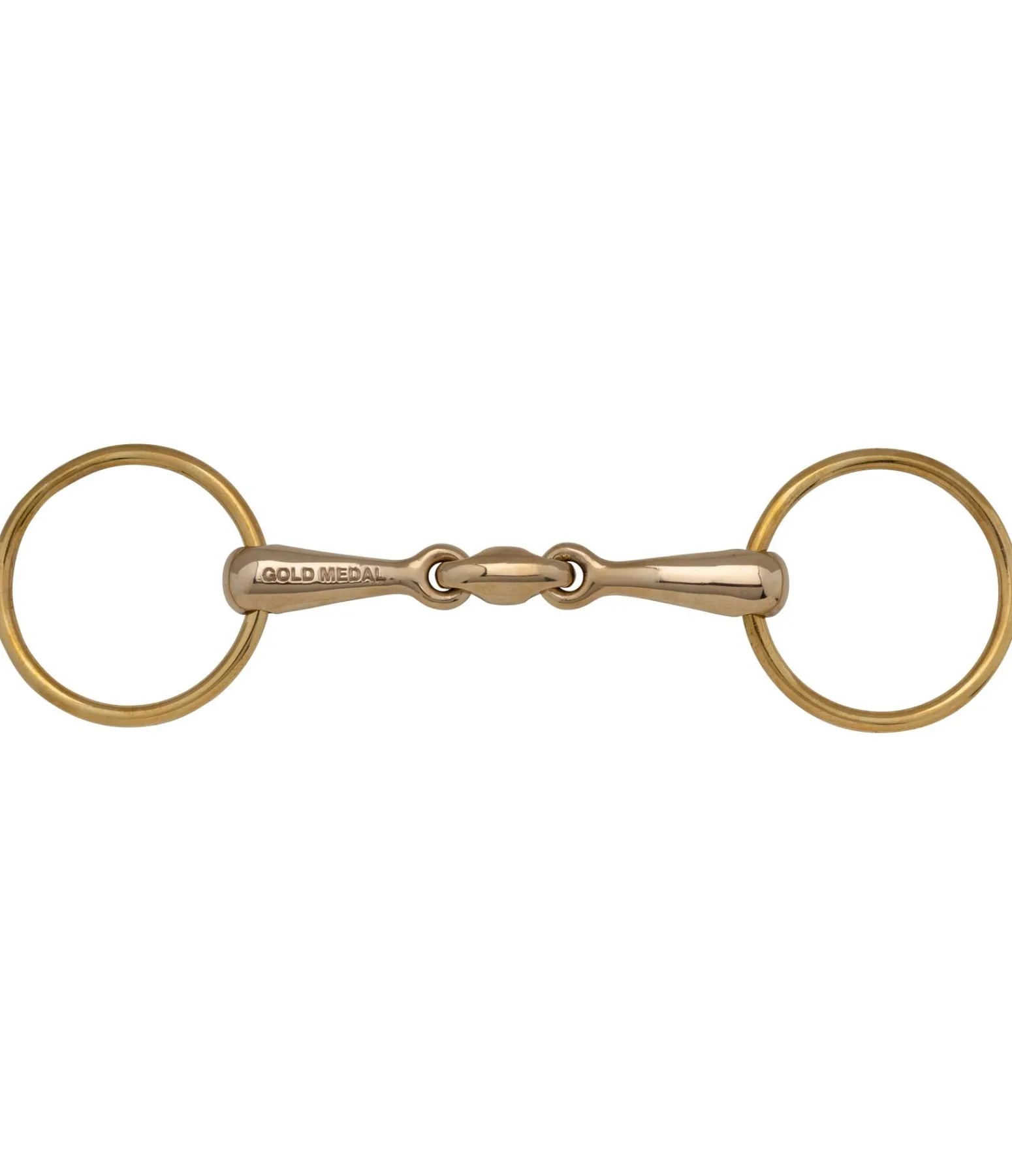 Mors à anneaux double brisure en laiton doré. Forme anatomique. Épaisseur 18 mm. Anneaux 70 mm.