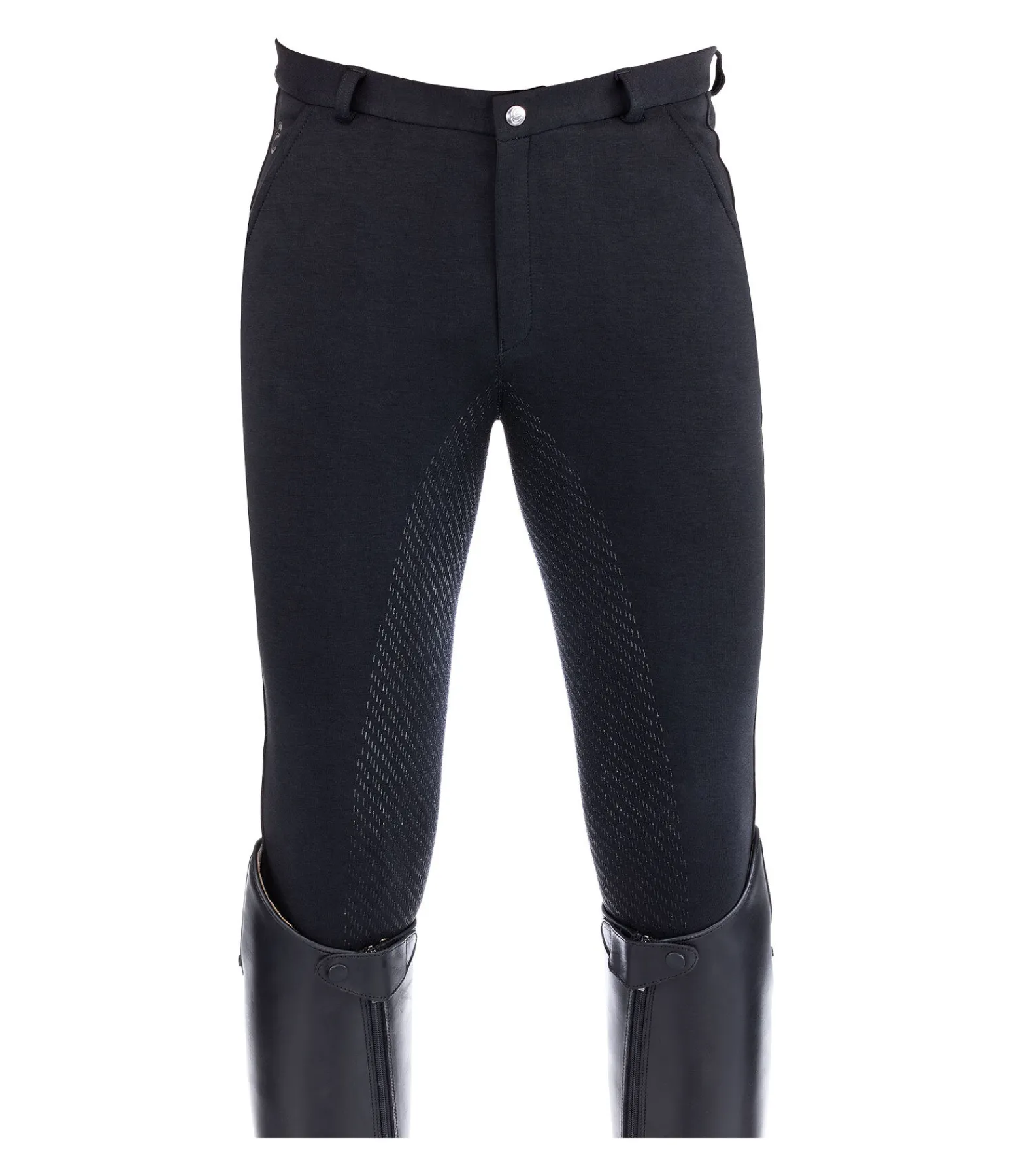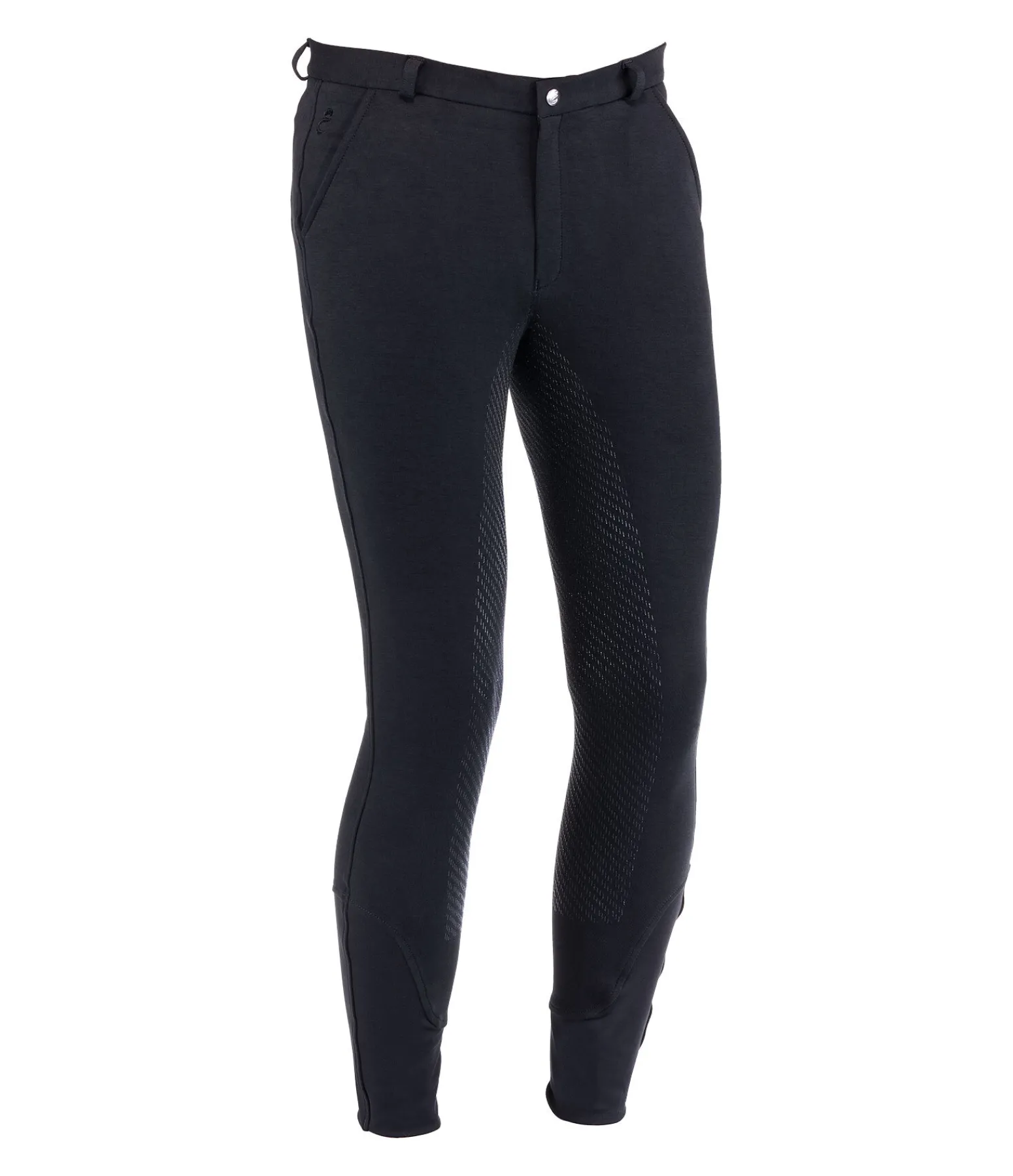 Pantalon d’équitation tendance avec fond intégral Grip siliconé. 2 poches avant et 2 poches arrière. Imprimé discret logo Equilibre. Bas de jambe extensible. Passants de ceinture. 95 % coton, 5 % élasthanne.