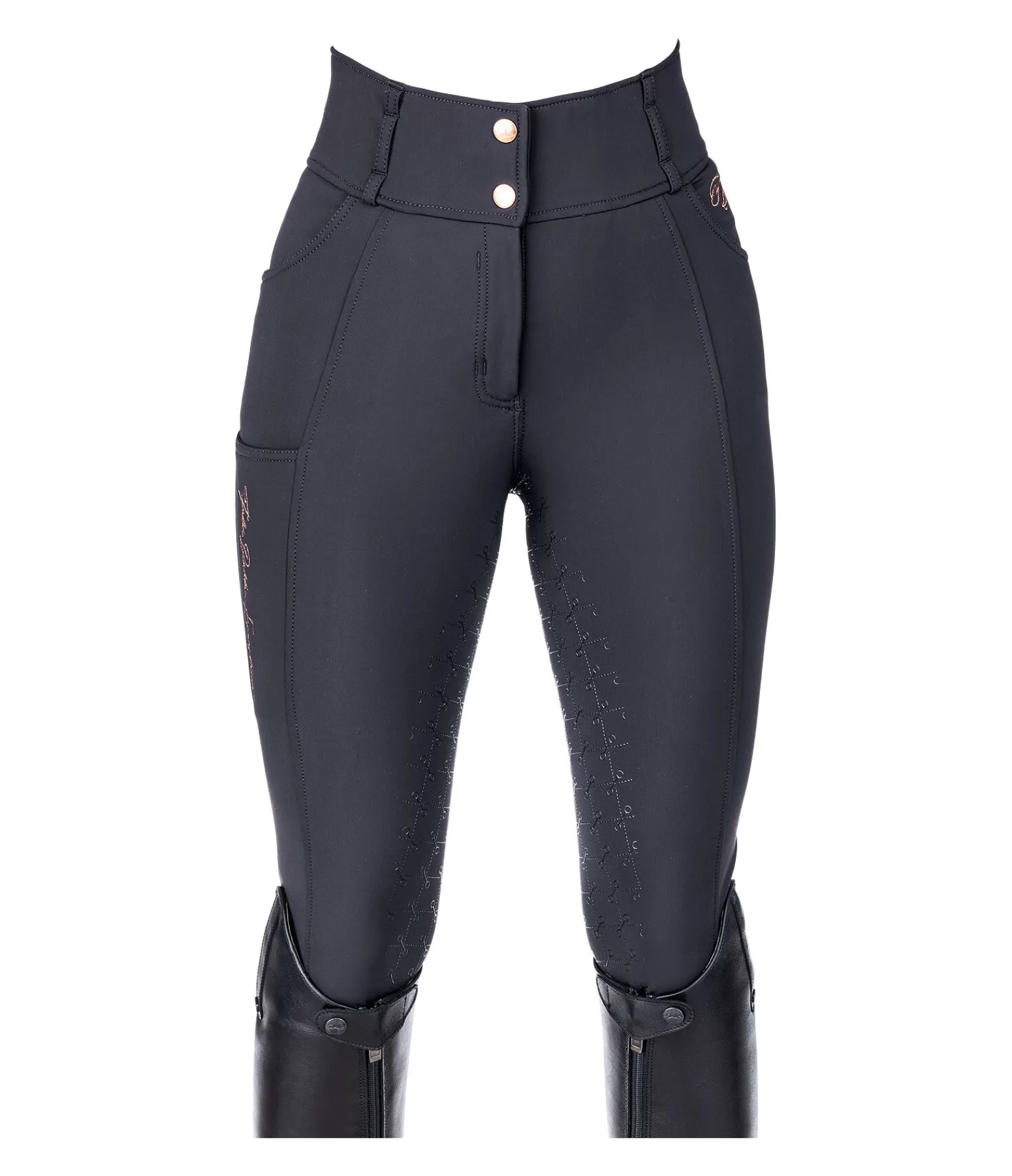 Pantalon d’équitation chaud et extensible. Fond intégral grip en silicone avec motifs de mors. Matière respirante et coupe-vent. Intérieur confortable. Broderie Felix Bühler sur la jambe. Une poche arrière zippée, une poche latérale sur la cuisse pour téléphone portable et deux poches avant. Large ceinture élastiquée avec 2 boutons. Aucune couture au niveau des genoux. Bas de jambe extensible en matière stretch. 77 % polyamide, 23 % élasthanne.