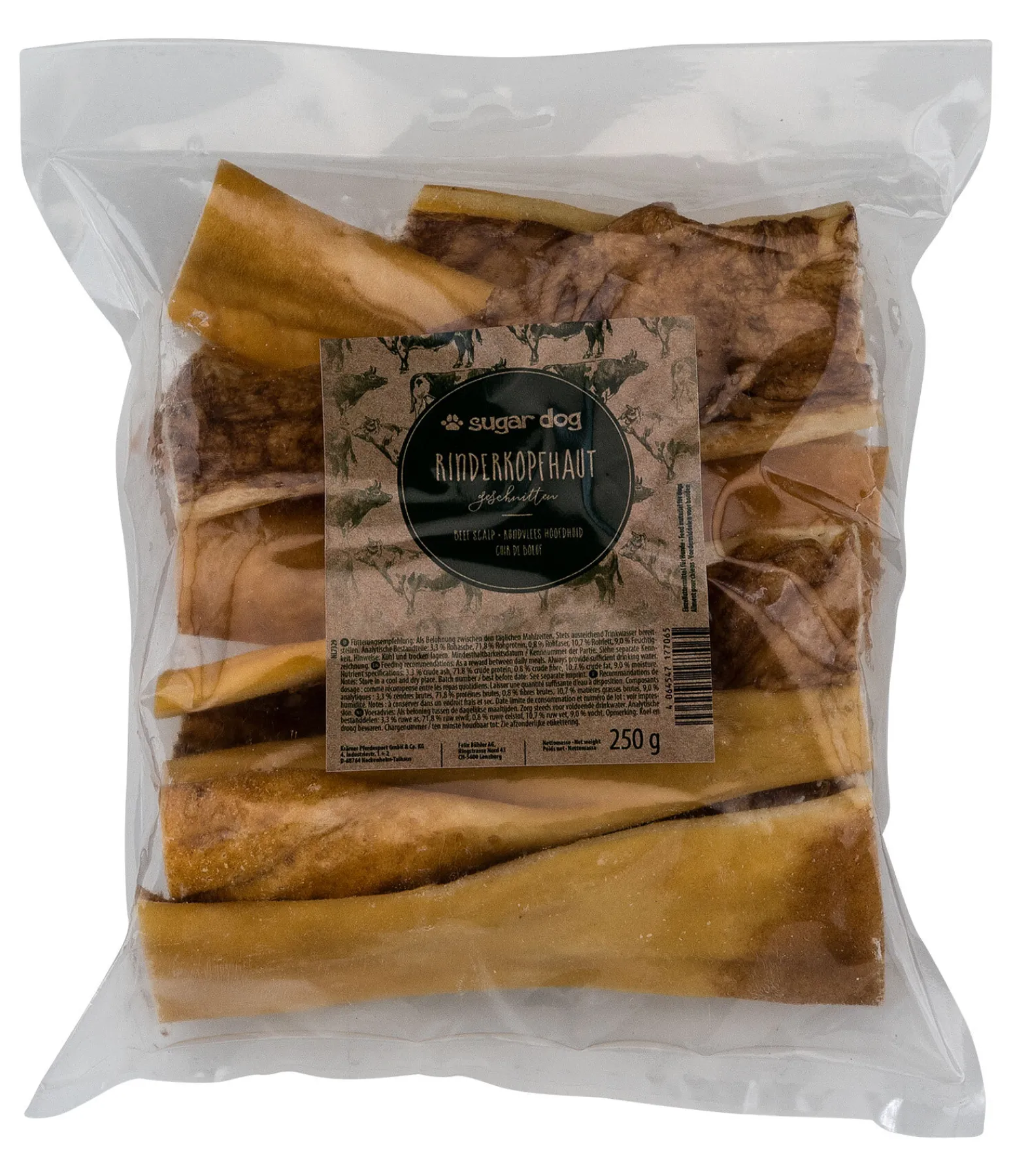 Lamelles de peau de tête de boeuf séchées et coupées pour un plaisir à mâcher durable. Produite en Autriche. Longueur : environ 15 cm. 250 g.