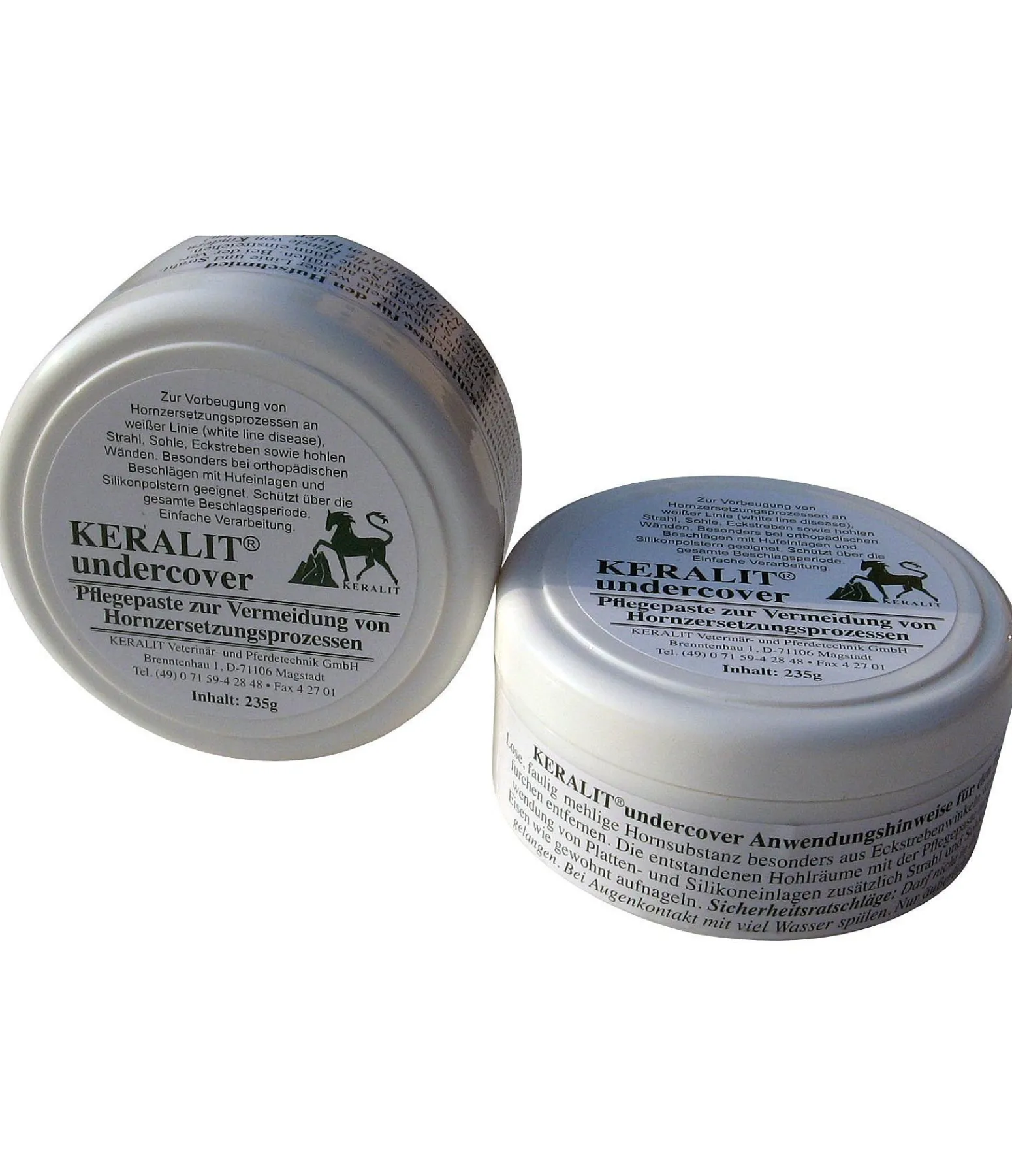 KERALIT Undercover est une pommade fortement adhérente, composée d’épices végétales tels que le curcuma et de minéraux à forte dispersion tels que les extraits d’écorce de diverses essences d’arbres, par exemple l’écorce de chêne. La base même de la pommade assure une libération régulière des principes actifs sur 7 à 8 semaines. Keralit Undercover est spécialement développée pour prévenir et traiter le processus de décomposition de la corne sur les lignes blanches, les lacunes médianes et latérales, la sole et la fourchette. Dangereux. Respecter les précautions d’emploi.