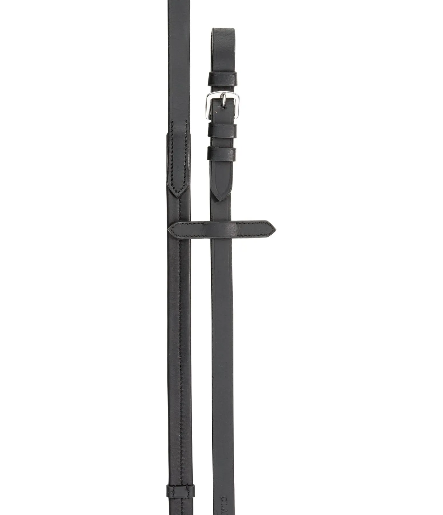 Rênes en cuir gras souple, avec arrêtoirs de martingale et bouclerie argentée. Prise en main pratique et agréablement souple. 290 x 1,9 cm.