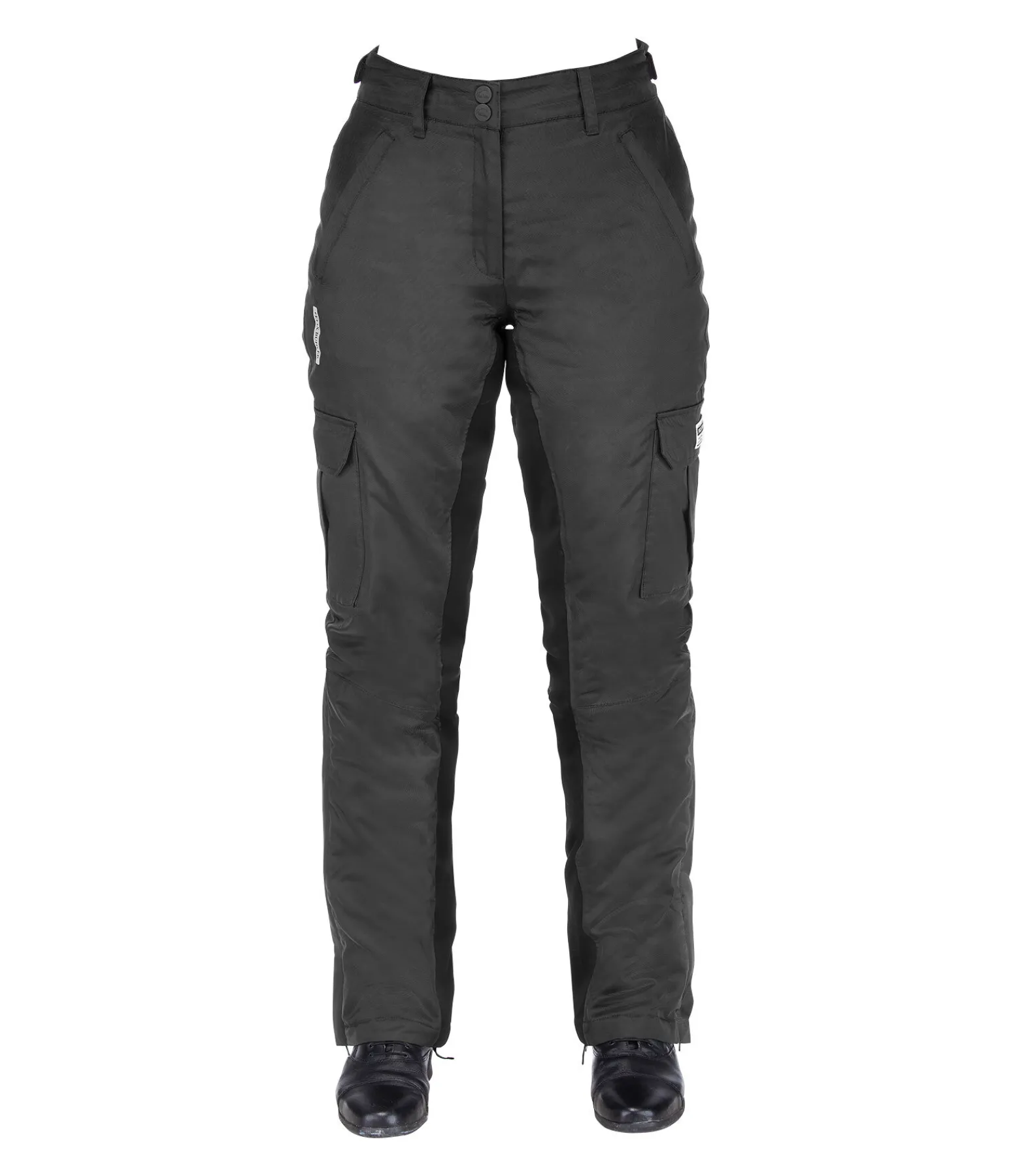 Fonctionnel et extra chaud ! Sur-pantalon d’équitation d’hiver cargo. Matière imperméable (8.000 mm), coupe-vent et particulièrement respirante (5.000 MVP). Doublure extra chaude imitation duvet. Fond intégral en synthétique. Taille réglable réhausée à l’arrière. 2 poches avant zippées et dissimulées, 1 poche cargo avec fermeture par patte auto-agrippante sur chaque cuisse. Bas de jambe zippé avec large bande réfléchissante. Guêtres pare-neige. 100 % nylon.