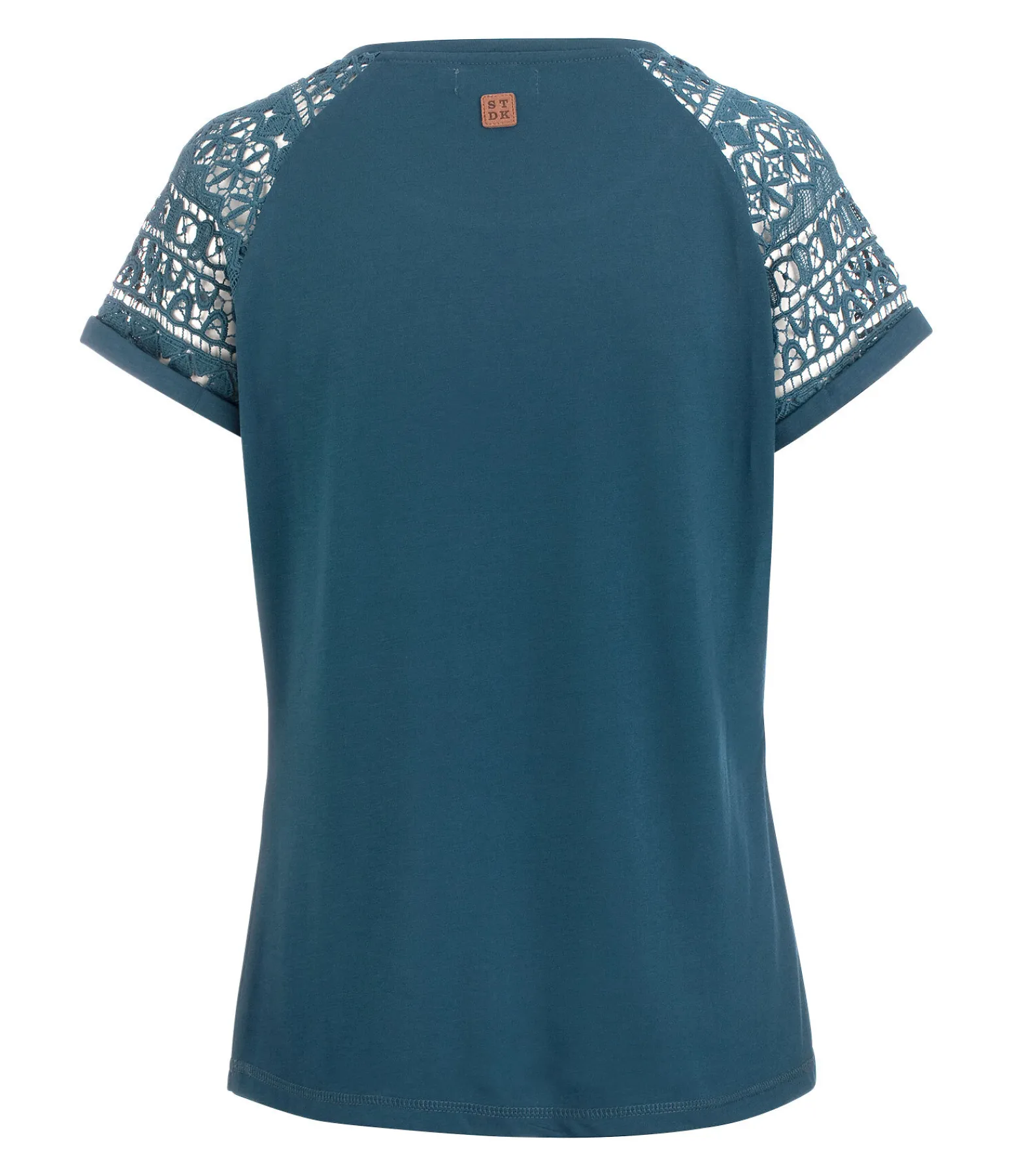 T-shirt à col rond. Coupe ample. Manches en dentelle. Matière respirante. 62 % polyester, 33 % viscose, 5 % élasthanne.