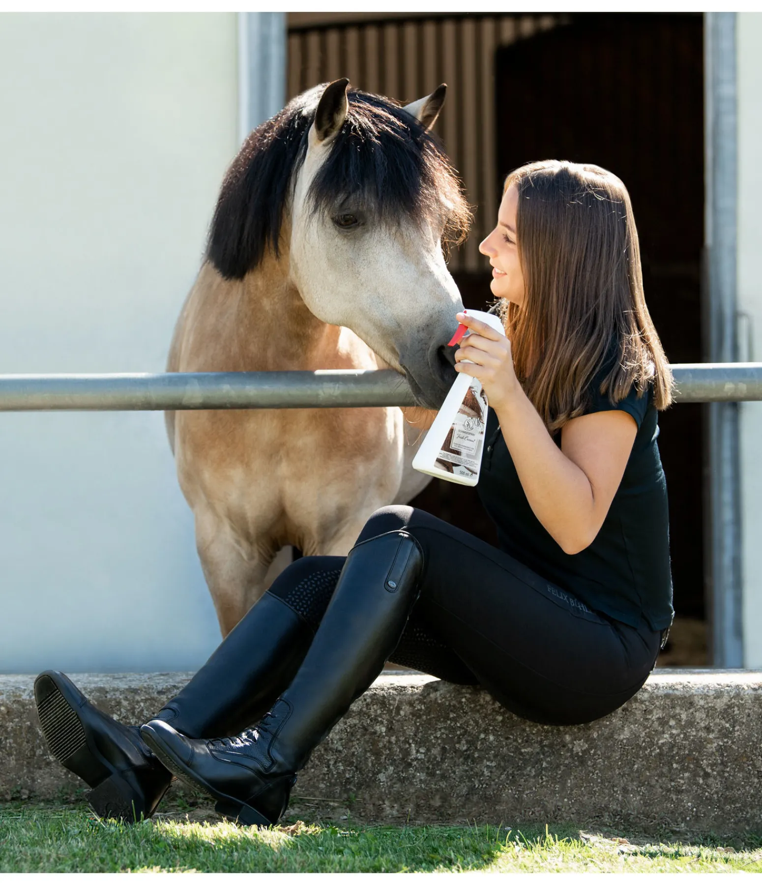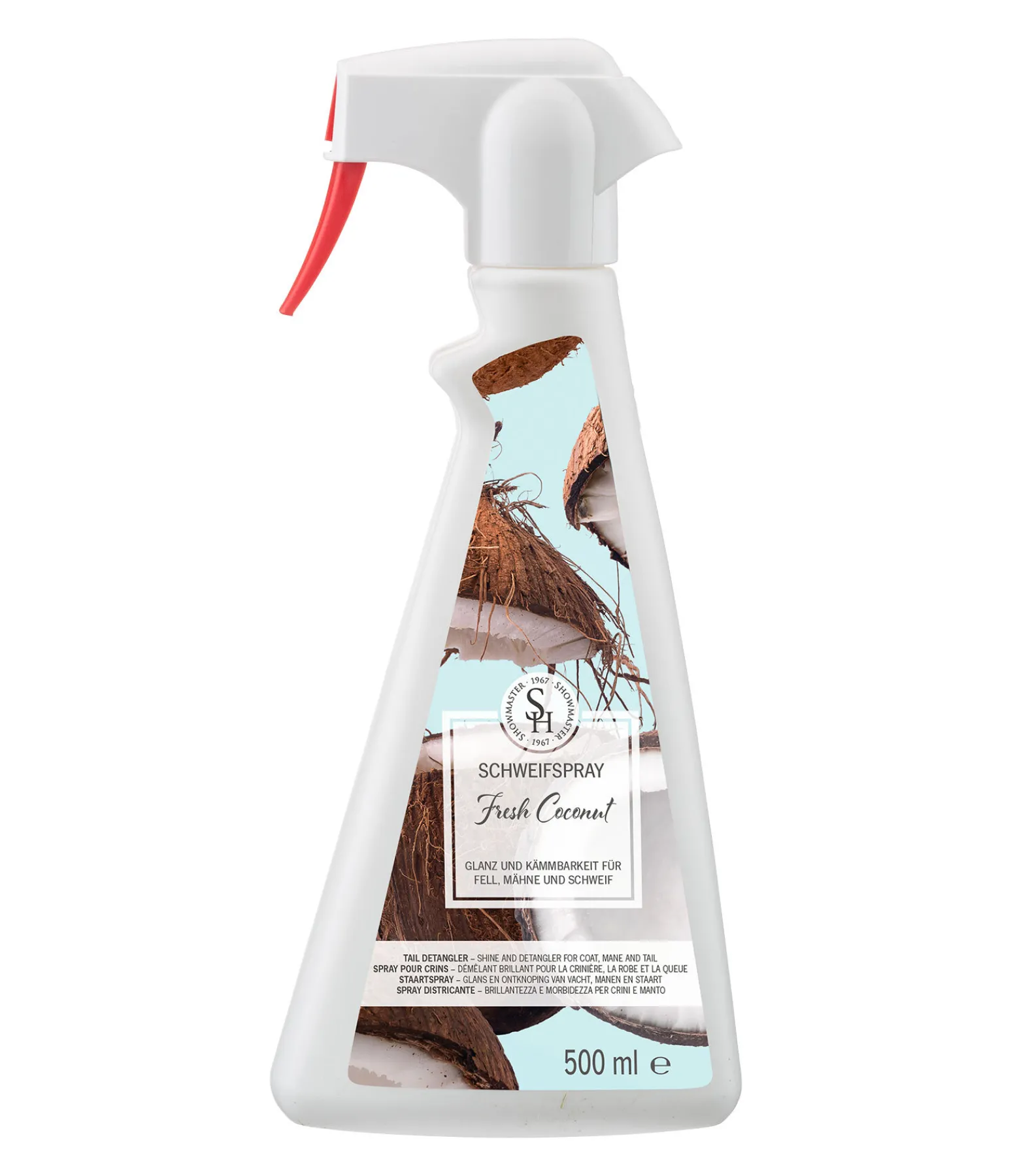 Spray à crins au parfum frais de noix de coco tropicale pour le soin de la crinière, de la queue et de la robe. Les crins sont plus faciles à brosser et parfaitement démêlés. Confère à la robe une brillance soyeuse et une plus longue protection contre la poussière. Pendant toute la période d’effet du produit, la crinière et la robe de votre cheval seront brillants et soignés. Un lavage préalable n’est pas nécessaire, le démêlage de la crinière et de la queue doit se faire immédiatement après l’utilisation du produit. En outre, la perte des crins lors du brossage est réduite de manière significative. Les tâches d’urine ou d’herbe une fois sèches peuvent disparaître facilement avec le brossage. En plus de l’utilité cosmétique du spray pour crins SHOWMASTER, il existe un autre avantage décisif pour votre cheval : une queue bien démêlée chasse beaucoup mieux les insectes qu’une queue mince et emmêlée. Également intéressant pour les juments en chaleur pour éviter que les longs crins ne les gênent pendant cette période. Le spray crinière et queue est doux pour la peau et n’obstrue pas les pores – peau et robe sont soigneusement entretenues.