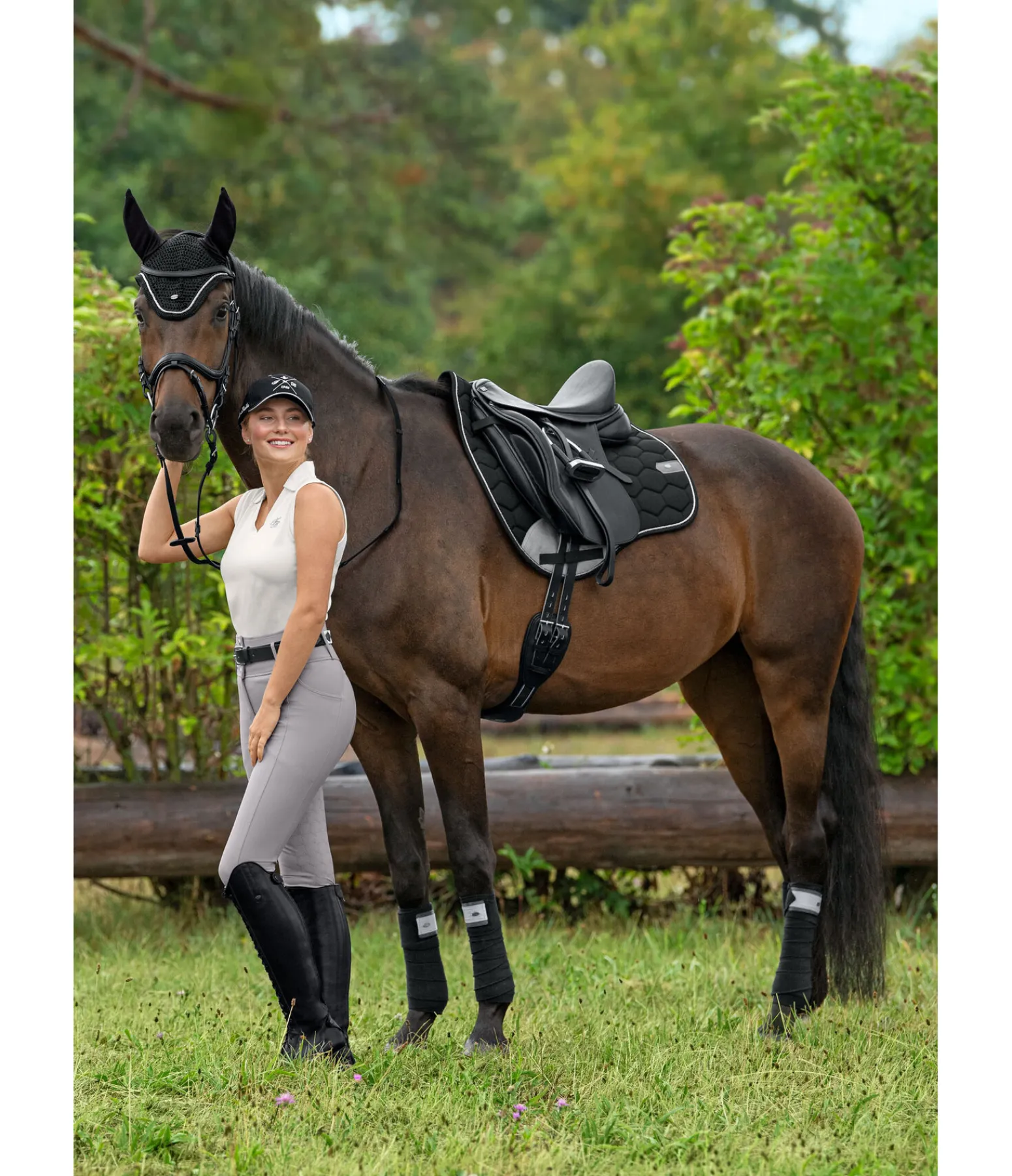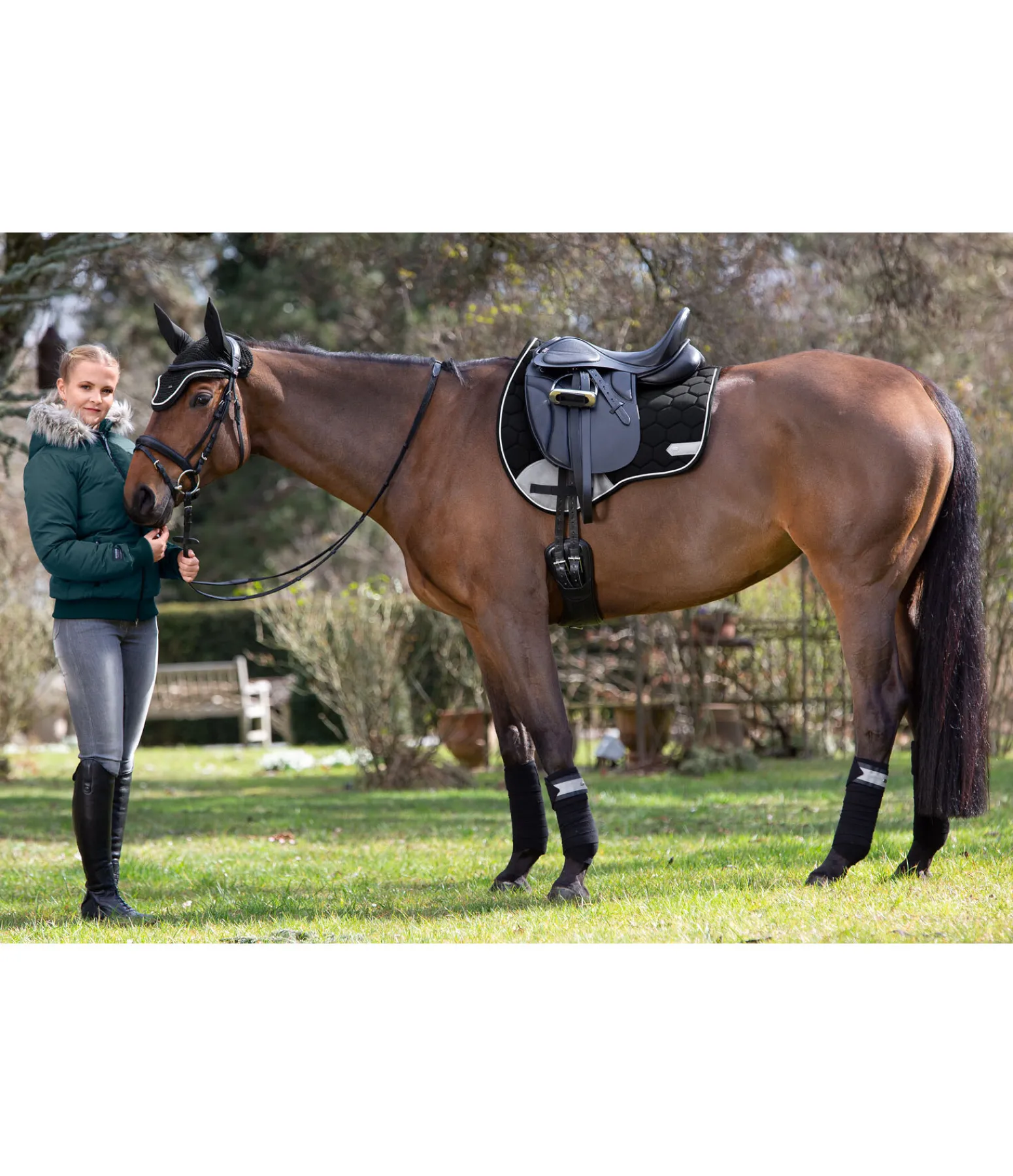Tapis de selle dans une coupe sportswear avec protection contre les frottements de couleur contrastante à l’aspect velours au passage de sangle. Petite plaque argentée filigrane avec logo gravé de chaque côté et cordon décoratif discret satiné de couleur contrastante. Passants de sangle et de contre-sanglons avec patte auto-agrippante pratique. Dessous en Air mesh respirant et absorbant l’humidité. Dessus 100 % coton, rembourrage et dessous 100 % polyester.