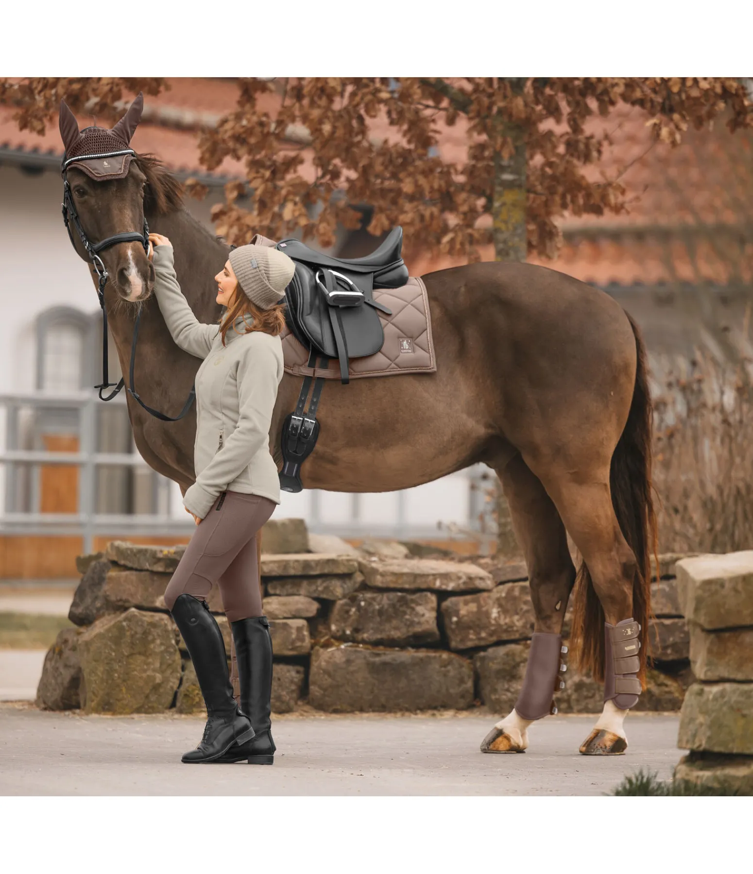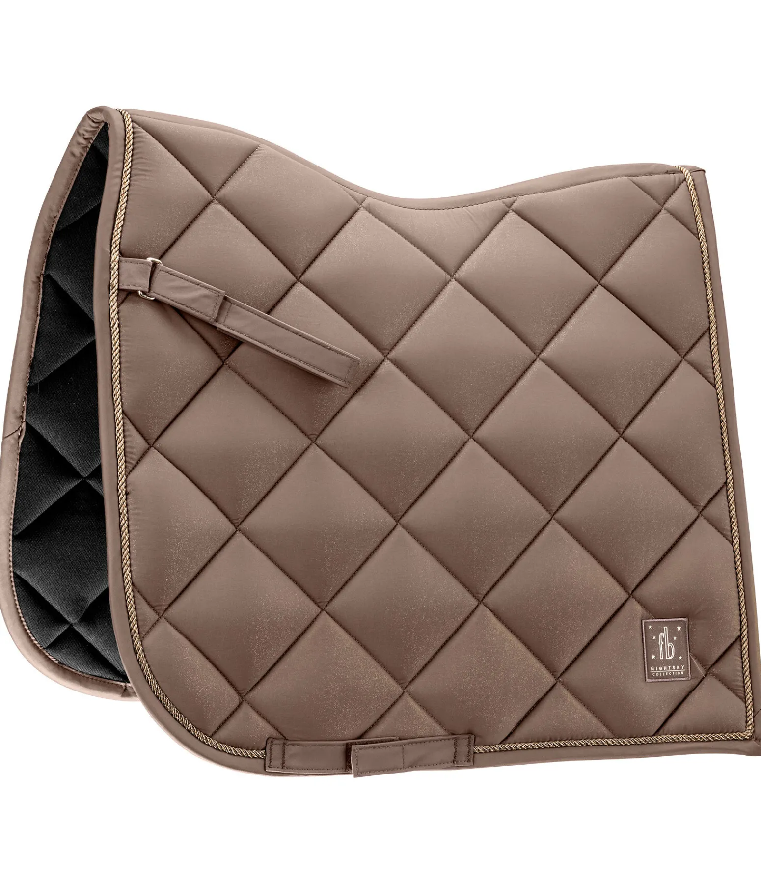 Élégant tapis de selle de forme carrée avec un soupçon de paillettes sur toute la matière supérieure et cordon décoratif scintillant. Logo de couleur assortie. Passants de contre-sanglons amovibles et passants de sangle avec pattes auto-agrippantes pratiques. Dessous en Air mesh respirant et absorbant l’humidité.