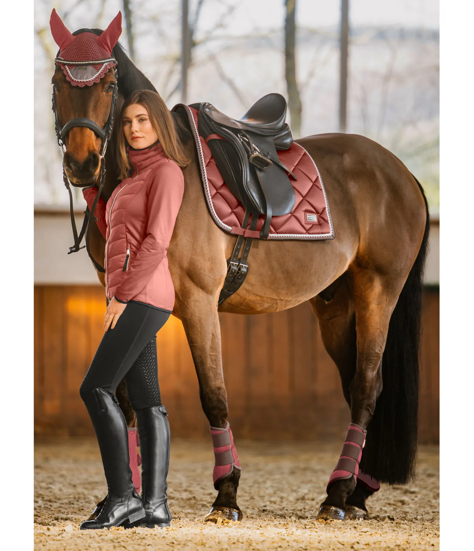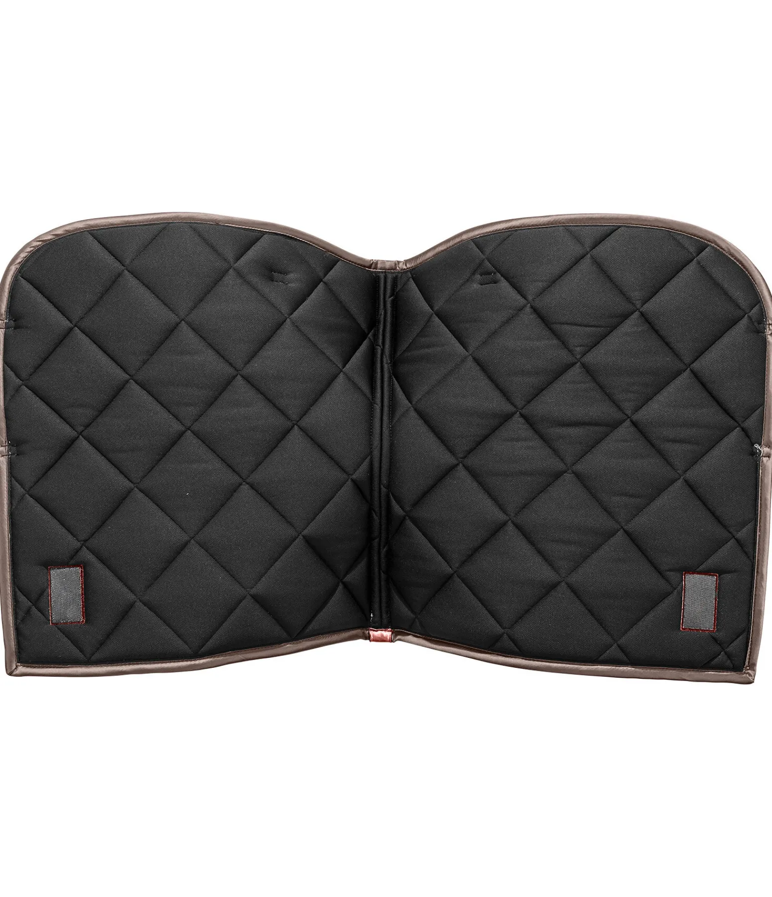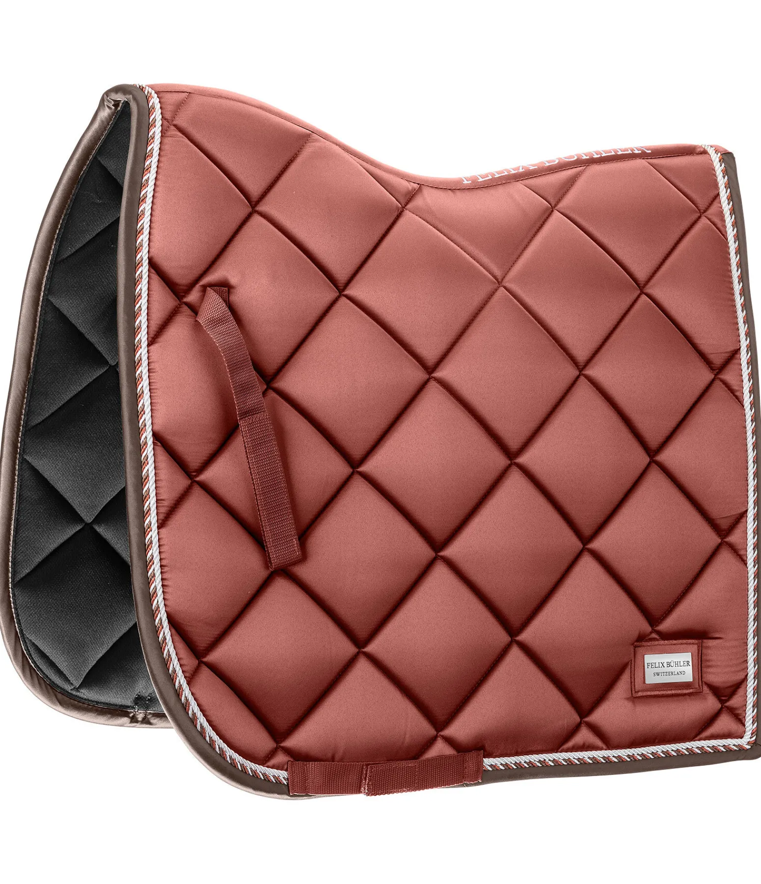 Tapis de selle de forme carrée. Petite plaque argentée avec logo. Tissu satiné. Cordons décoratifs de couleur assortie. Passants de sangle et de contre-sanglons avec patte auto-agrippante pratique. Dessous en Air mesh respirant et absorbant l’humidité. 100 % polyester.